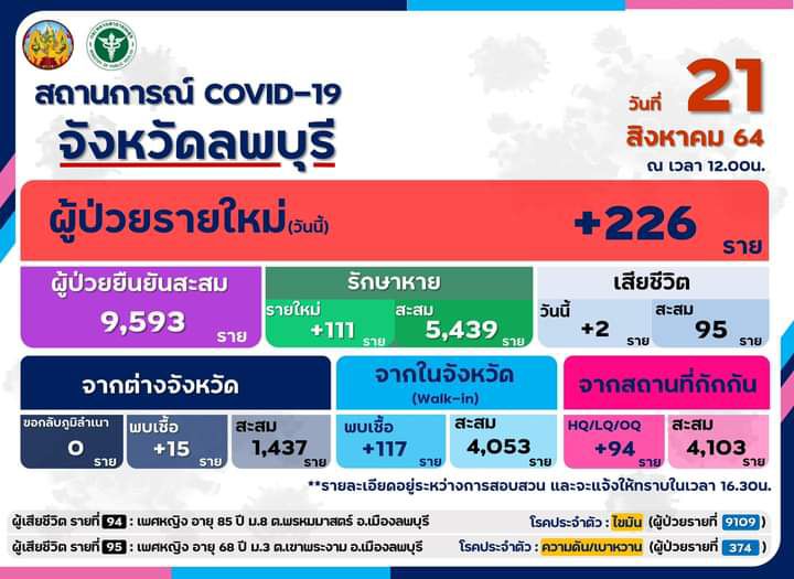 รายงานสถานการณ์โควิด-19 จังหวัดลพบุรี วันเสาร์ที่ 21 สิงหาคม 2564 ณ เวลา 12.00 น.