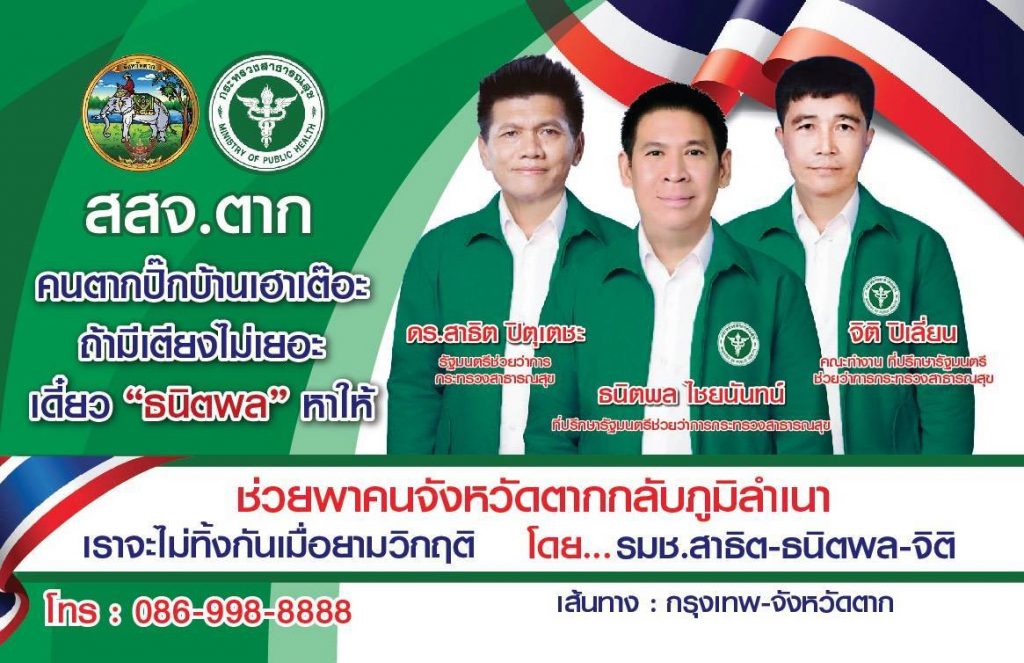 วันนี้ผม (นายธนิตพล ไชยนันทน์ ที่ปรึกษารัฐมนตรีช่วยว่าการกระทรวงสาธารณสุข) เป็นประธานมอบรถยนต์กะบะให้กับจังหวัดตาก ตามนโยบายการช่วยเหลือประชาชน ของ ดร.สาธิต ปิตุเตชะ รัฐมนตรีช่วยว่าการกระทรวงสาธารณสุขและที่มงาน โดยนายแพทย์วิทยา พลสีลา นายแพทย์สาธารณสุขจังหวัดตาก ได้มอบหมายให้ นายประเสริฐ สอนเจริญทรัพย์ รองนายแพทย์สาธารณสุขจังหวัดตาก (ต้านบริการทางวิชาการ) พร้อมด้วยนายแพทย์สุธา ภัทรกิจรุ่งเรื่อง ผู้อำนวยการโรงพยาบาลแม่ระมาด นายฉัตรชัย อิ่มอ่อง สาธารณสุขอำเภอแม่ระมาต และเจ้าหน้าที่สาธารณสุขที่เกี่ยวข้อง เป็นผู้รับมอบ
