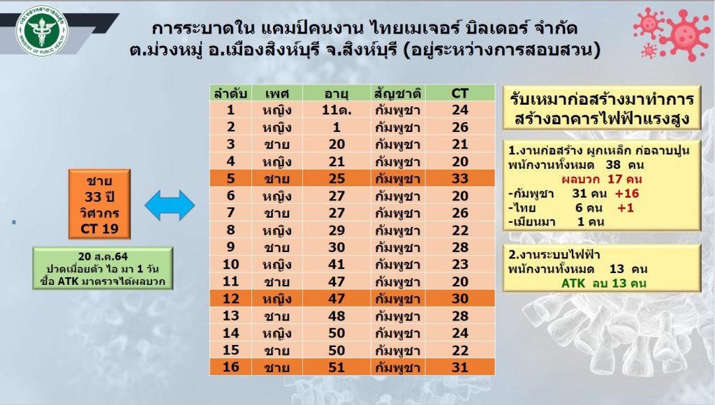 โดยวิศวกรและคนงานก่อสร้างที่ติดเชื้อเป็นคนงานของบริษัท ไทยเมเจอร์ บิลเดอร์ จำกัด เป็นบริษัทจากต่างจังหวัด รับงานต่อมาจากอีกบริษัทหนึ่ง มาทำการก่อสร้างอาคารไฟฟ้าแรงสูง มีผู้คนงานประมาณ 50 คน เป็นแรงงานต่างด้าวจำนวนประมาณ 35 คน วิศวกรที่ติดเชื้อมีเป็นชายอายุ 33 ปี ประวัติมีการเดินทางไปตรวจงานที่ต่างจังหวัดหลายครั้ง ส่วนคนงานที่ติดเชื้ออีก 16 คน เป็นชาวกำพูชาทั้งหมด ขณะนี้ผู้ติดเชื้อทั้งหมดได้เข้ารักษาตัวในโรงพยาบาลเป็นที่เรียบร้อยแล้ว