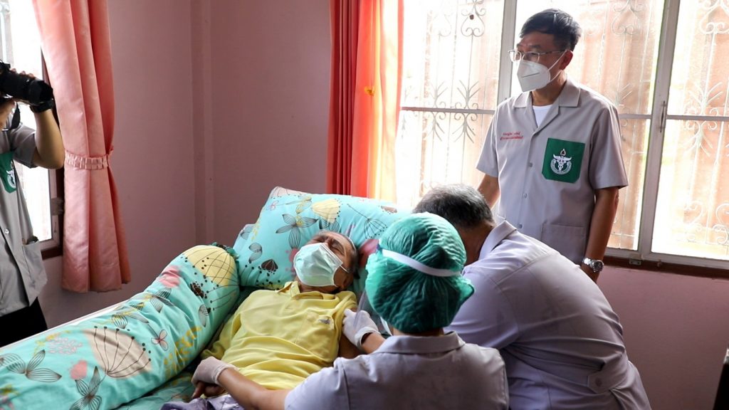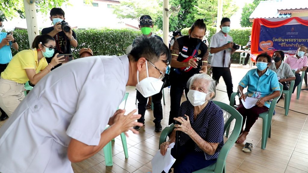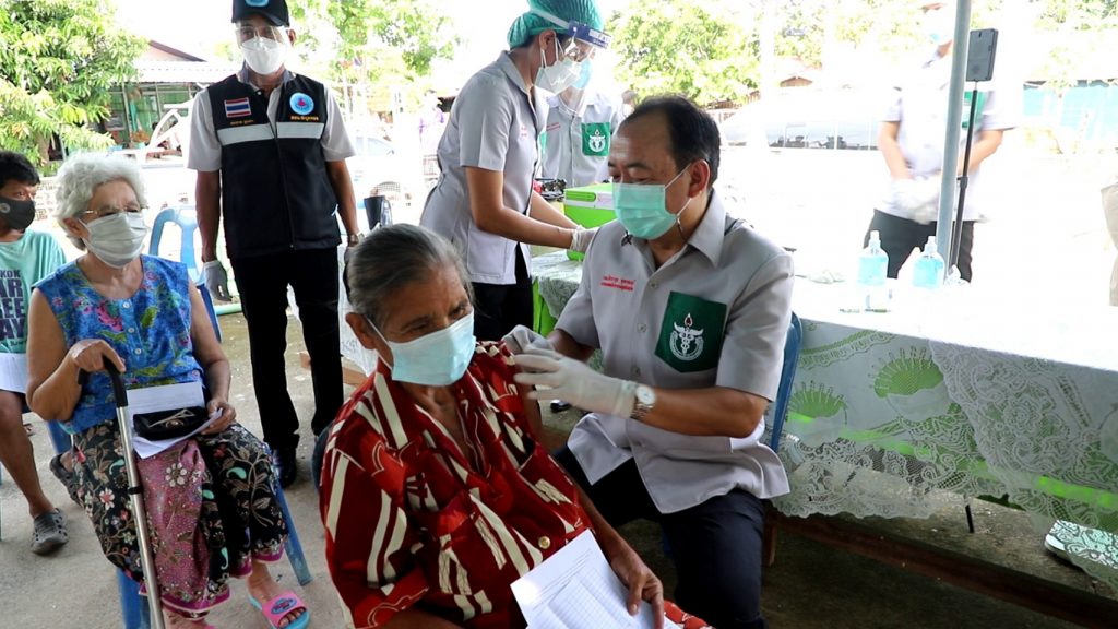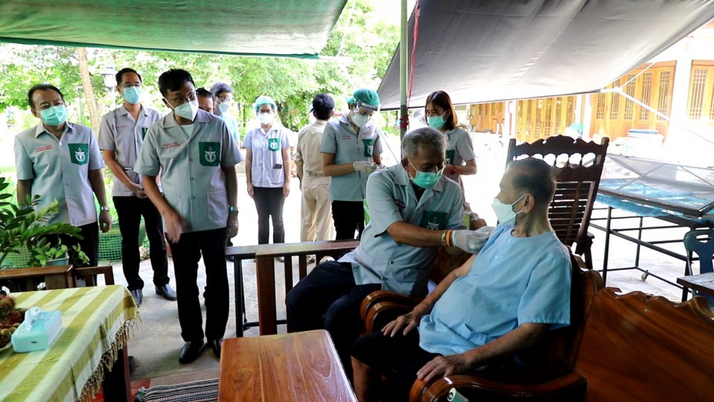 จากนั้นได้เดินทางไปยังจุดฉีดวัคซีนพระราชทานจุดที่ 2 บริเวณหน้าที่ทำการผู้ใหญ่บ้านหมู่ที่ 2 ตำบลถอนสมอ อำเภอท่าช้าง พบแพทย์ พยาบาล อาสาสมัครสาธารณสุข หรือ อสม. ให้บริการฉีดวัคซีนให้กับกลุ่มเป้าหมาย ในพื้นที่ตำบลถอนสมอและตำบลใกล้เคียง โดยก่อนที่จะเดินทางกลับผู้ว่าราชการจังหวัดสิงห์บุรี พร้อมคณะ และแพทย์ ได้เดินไปยังบ้านผู้สูงอายุที่ติดเตียงเพื่อทำการฉีดวัคซีนพระราชทานตามโครงการ ในพื้นที่ใกล้เคียงกันอีกจำนวน 2 คน