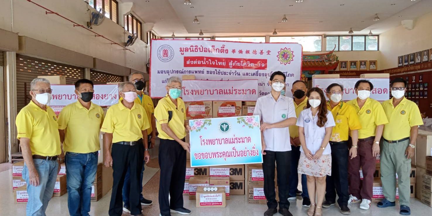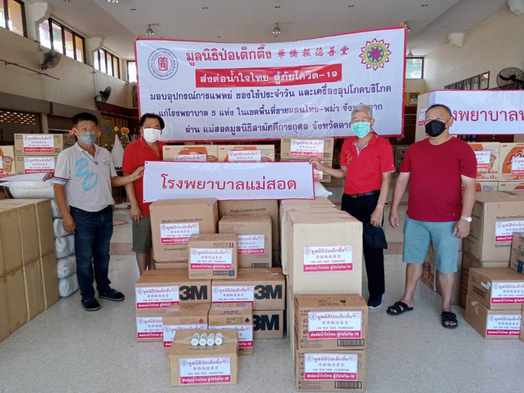 มูลนิธิป่อเต็กตึ๊ง โดย นายวิเชียร เตชะไพบูลย์ ประธานกรรมการฯ มอบหมายให้ฝ่ายสังคมสงเคราะห์ จัดส่งอุปกรณ์ทางการแพทย์ ของใช้ประจำวัน และเครื่องอุปโภคบริโภค ประกอบด้วย ชุดอุปกรณ์ป้องกันส่วนบุคคล (PPE) หน้ากาก N 95 ยาฟ้าทะลายโจร หน้ากากอนามัย ข้าวสาร บะหมี่กึ่งสำเร็จรูป แป้งหอม สบู่ ยาสีฟัน แปรงสีฟัน และยาสระผม ให้แก่ โรงพยาบาลในเขตพื้นที่ชายแดนไทย-พม่า จังหวัดตาก ได้แก่ โรงพยาบาลอุ้มผาง โรงพยาบาลท่าสองยาง โรงพยาบาลแม่ระมาด โรงพยาบาลพบพระ และโรงพยาบาลแม่สอด รวม5 แห่ง ผ่านแม่สอดมูลนิธิสามัคคีการกุศล รวมงบประมาณเป็นเงิน 500,640 บาท (ห้าแสนหกร้อยสี่สิบบาทถ้วน) โดยมี นายสมศักดิ์ คะวีรัตน์ ประธานแม่สอดมูลนิธิสามัคคีการกุศล พร้อมคณะ เป็นผู้แทนมูลนิธิป่อเต็กตึ๊งในการมอบฯ เมื่อวันที่ 23 สิงหาคม 2564 ที่ผ่านมา ณ ที่ทำการของแม่สอดมูลนิธิสามัคคีการกุศล จังหวัดตาก
