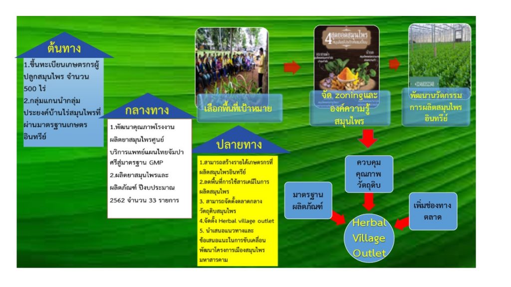 นักวิจัย กล่าวอีกว่า โครงการนาดูนโมเดลต้นแบบสมุนไพร GAP สู่การขับเคลื่อนเมืองสมุนไพรจังหวัดมหาสารคาม เป็นการผลิตสมุนไพรในระบบ GAP มีการผลิตตั้งแต่ต้นทาง ได้แก่ การขึ้นทะเบียนผู้ปลูกสมุนไพร จำนวน 500 ไร่ และกลุ่มแกนนำประยงค์บ้านไร่สมุนไพรที่ผ่านมาตรฐานเกษตรอินทรีย์ กลางทาง ได้แก่ การพัฒนาคุณภาพโรงงานผลิตยาสมุนไพรศูนย์บริการแพทย์ไทยจัมปาศรีสู่มาตรฐาน GMP และผลิตยาสมุนไพรและผลิตภัณฑ์ และปลายทาง ได้แก่ สามารถสร้างรายได้เกษตรกรที่ผลิตสมุนไพรอินทรีย์ ลดพื้นที่การใช้สารเคมีในการผลิตสมุนไพร สามารถจัดตั้งตลาดกลางวัตถุดิบสมุนไพร รวมถึงการจัดตั้ง Herbal village outlet และ นำเสนอแนวทางและข้อเสนอแนะในการขับเคลื่อนพัฒนาโครงการเมืองสมุนไพรมหาสารคาม จนสามารถสร้างเครือข่ายการผลิตสมุนไพรและแปรรูปผลิตภัณฑ์สมุนไพรให้มีคุณภาพได้มาตรฐาน GAP และ GACP รวมถึงสร้างรายได้ให้กับกลุ่มเกษตร โดยการหาช่องทางการตลาดในหลายๆ ภาค