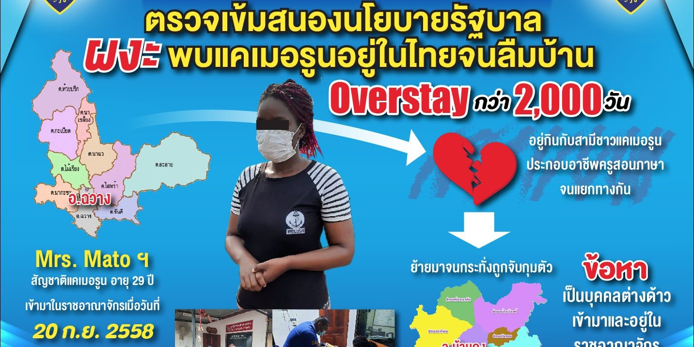 เจ้าหน้าที่ได้เข้าตรวจสอบในพื้นที่ ต.ศรีสุทโธ อ.บ้านดุง จ.อุดรธานี พบหญิงชาวต่างชาติลักษณะมีพิรุธพยายามจะเดินหลบหนีเจ้าหน้าที่ตำรวจ เจ้าหน้าที่จึงได้แสดงตัว และทำการขอตรวจสอบหนังสือเดินทางทราบชื่อว่า MRS.MOTO สัญชาติ CAMEROON อายุ 29 ปี จากการตรวจสอบหนังสือเดินทางพบว่าเข้ามาได้รับการเข้ามาอยู่ในประเทศไทยเป็นการชั่วคราว โดยการอนุญาตสิ้นสุดไปตั้งแต่วันที่ 10 ธ.ค.58 หรือเป็นระยะเวลากว่า 2,000 วัน จากพฤติกรรมดังกล่าวจึงเป็นการกระทำที่ฝ่าฝืนกฎหมายตาม พ.ร.บ.คนเข้าเมือง พ.ศ.2522