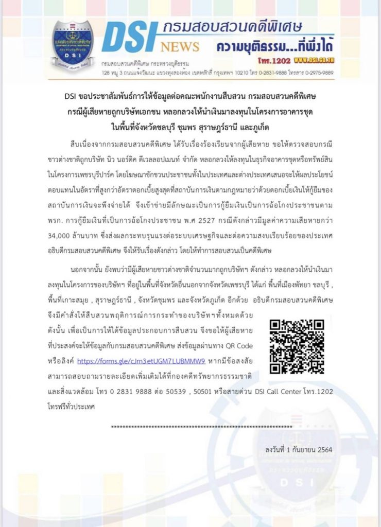 ดังนั้น เพื่อเป็นการให้ได้ข้อมูลประกอบการสืบสวน จึงขอให้ผู้เสียหายที่ประสงค์จะให้ข้อมูลกับกรมสอบสวนคดีพิเศษ ส่งข้อมูลผ่านทาง QR Code