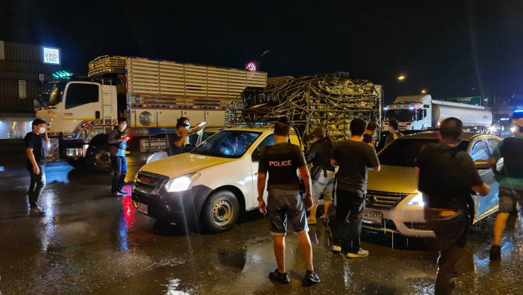 ต่อมาวันที่ 1 ก.ย.64 เจ้าหน้าที่ตำรวจได้สืบทราบว่าเครือข่ายกลุ่มนี้จะลักลอบลำเลียงยาบ้าลงสู่ภาคใต้ จึงได้วางกำลังตามเส้นทางที่ได้สืบสวนมาแล้ว จนกระทั่งพบรถยนต์กระบะยี่ห้ออีซูซุ รุ่นดีเม็กซ์ สีขาว ทะเบียน บห 4238 พิษณุโลก ซึ่งบรรทุกผักเต็มบริเวณท้ายรถ และมีรถยนต์กระบะ ยี่ห้อโตโยต้า รีโว สีเทา หมายเลขทะเบียน 3ฒข 773 กรุงเทพมหานคร ขับนำหน้าโดยใช้เส้นทางบางบัวทอง-สุพรรณบุรี และเข้าเส้นทางถนนกาญจนาภิเษก (ตะวันตก) เจ้าหน้าที่ตำรวจจึงติดตามรถทั้งสองคันไปจนกระทั่งรถยนต์กระบะยี่ห้ออีซูซุฯ ชะลอความเร็วก่อนเข้าบริเวณด่านตรวจสกัดกั้นโควิด-19 ของ อ.บางบัวทอง เจ้าหน้าที่ตำรวจจึงเข้าไปแสดงตัวขอตรวจค้นพบยาบ้าซุกซ่อนปะปนไว้กับผักกะหล่ำปลีที่บริเวณท้ายรถกระบะ ส่วนรถยนต์กระบะยี่ห้อโตโยต้าฯ ที่ทำหน้าที่นำทางนั้น ได้ขับหลบหนีการจับกุมเจ้าหน้าที่ตำรวจไปจอดทิ้งไว้ที่บริเวณ ซ.เปี่ยมสุข ถ.บางกรวย-ไทรน้อย ต.บางรักพัฒนา อ.บางบัวทอง จ.นนทบุรี ส่วนคนขับได้อาศัยความมืดหลบหนีไป