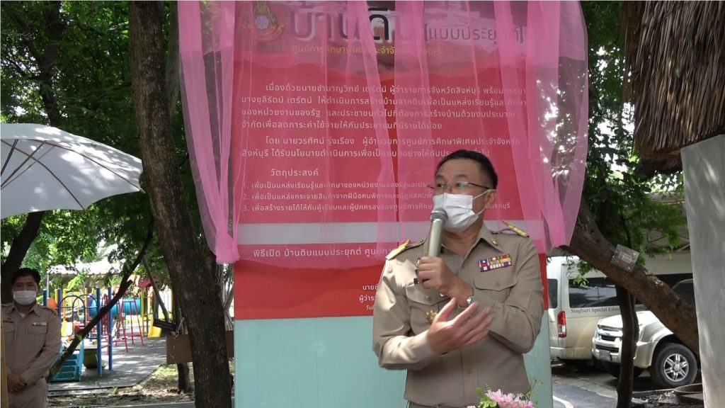 ต่อจากนั้น นายชำนาญวิทย์ เตรัตน์ ผู้ว่าราชการจังหวัดสิงห์บุรี เป็นประธานเปิดบ้านดิน แบบประยุกต์ เพื่อจัดตั้งเป็นร้านสวัสดิการ จำหน่ายผลิตภัณฑ์จากนักเรียน ผู้ปกครอง คณะครู และบุคลากร เพื่อนำรายได้มาหมุนเวียนและพัฒนากิจกรรมส่งเสริมประเภทต่างๆของศูนย์การศึกษาพิเศษจังหวัดสิงห์บุรี โดยการทำบ้านดินให้กับบุคลากรในศูนย์การศึกษาพิเศษฯนำไปต่อยอดเพื่อสร้างสวัสดิการให้กับบุคลากรและเด็กออทิสติกและเด็กพิการ เป็นแบบอย่างโครงการที่ดีให้กับชุมชน