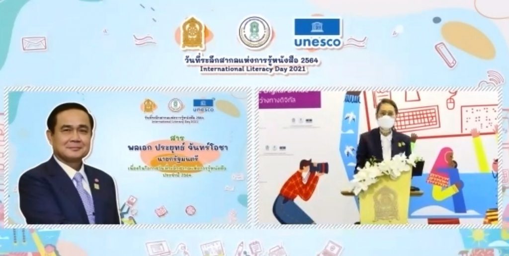 จากนั้น รมช.ศึกษาธิการ ได้อ่านสารจาก พลเอก ประยุทธ์ จันทร์โอชา นายกรัฐมนตรี ความตอนหนึ่งว่า รัฐบาลได้ให้ความสำคัญต่อการพัฒนาคุณภาพด้านการศึกษา ซึ่งจะช่วยพัฒนาศักยภาพและคุณภาพชีวิตของคนไทยในสังคมฐานความรู้ในโลกยุคดิจิทัล ท่ามกลางวิกฤตสถานการณ์การแพร่ระบาดของโรคโควิด-19 เป็นโอกาสและปัจจัยเร่งให้เกิดการพัฒนารูปแบบและวิธีการเรียนรู้ของผู้คน รวมทั้งทำให้การจัดการเรียนการสอนในแบบเดิมต้องปรับเปลี่ยนเป็นการเรียนการสอนแบบทางไกล เพื่อให้การเรียนรู้ดำเนินไปอย่างต่อเนื่อง แต่ขณะเดียวกันก็ส่งผลกระทบต่อโอกาสในการเข้าถึงการเรียนรู้ของบางกลุ่มในสังคมอย่างหลีกเลี่ยงไม่ได้ ดังนั้นเมื่อโลกเปลี่ยนแปลง รัฐบาลจึงเน้นการปรับระบบการศึกษาและการเรียนรู้ให้สอดคล้องกับสังคมโลกยุคใหม่ เพื่อปรับเปลี่ยนช่องว่างทางดิจิทัล ให้เป็น “โอกาสทางดิจิทัล” อันจะช่วยสนับสนุนการรู้หนังสือของเยาวชนและประชาชนทั่วไปที่ไม่รู้หนังสือให้เป็นผู้รู้หนังสือ มีความฉลาดเท่าทันโลก โดยไม่ถูกทิ้งไว้ข้างหลัง ดังนั้นจึงเป็นสิ่งสำคัญที่ทุกภาคส่วนต้องบูรณาการการดำเนินการร่วมกันให้เกิดผลอย่างเป็นรูปธรรมมากที่สุด