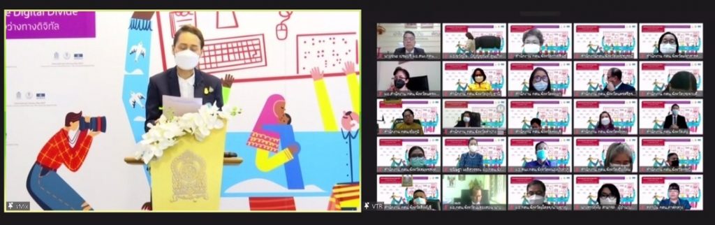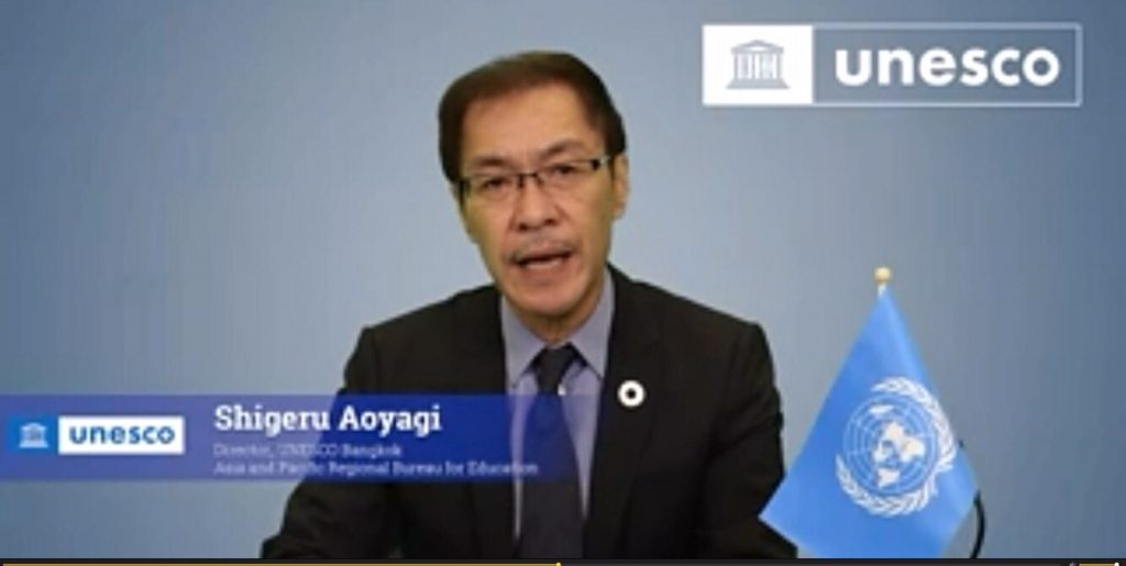 Mr.Shigeru Aoyagi ผู้อํานวยการองค์การการศึกษา วิทยาศาสตร์ และวัฒนธรรมแห่งสหประชาชาติ (UNESCO) สำนักงานกรุงเทพฯ กล่าวตอนหนึ่งว่า “การรู้หนังสือเพื่อการฟื้นคืนสู่การใช้มนุษย์เป็นศูนย์กลาง : การลดช่องว่างทางดิจิทัล” เน้นไปที่ความสำคัญของการรู้หนังสือและทักษะดิจิทัล โดยเฉพาะในบริบทของการแพร่ระบาดของโรคโควิด 19 ในภูมิภาคเอเชีย-แปซิฟิก พบว่า ร้อยละ 46 ของเยาวชน และ ร้อยละ 61 ของผู้ใหญ่ยังไม่รู้หนังสือ ความไม่เท่าเทียมในการรู้หนังสือนี้ขยายวงกว้างขึ้น จากการระบาดของโรคโควิด 19 ส่งผลกระทบต่อกลุ่มคนไม่รู้หนังสือดังกล่าว ซึ่งขาดความเข้าใจและข้อมูลที่จำเป็นต่อชีวิตการพัฒนาศักยภาพจนกลายเป็นกลุ่มเปราะบางในทุกมิติ ทักษะทางด้านดิจิทัลจึงเป็นพื้นฐานสำคัญอย่างยิ่งที่จะนำไปสู่การสร้างแรงงานที่มีทักษะสำหรับธุรกิจใหม่ๆ ตามที่ตลาดต้องการ อย่างไรก็ตาม ช่องว่างทางดิจิทัลในภูมิภาคเอเชีย-แปซิฟิกยังคงดำเนินต่อไป โดยมีแค่เพียง 37% ของครัวเรือนในชนบทที่เข้าถึงอินเทอร์เน็ต และทักษะด้าน ICT ของประเทศในภูมิภาคที่ได้รับการตรวจสอบ มีไม่ถึง 10% ขณะที่เรามุ่งหวังจะบรรลุเป้าหมาย 4 ของ SDG ในปี 2030 เราต้องเรียกร้องให้ประเทศดังกล่าว มั่นใจว่าจะทำให้กลุ่มเยาวชนและผู้ใหญ่ที่ไม่รู้หนังสือบรรลุเป้าหมายในเรื่องทักษะดิจิทัล