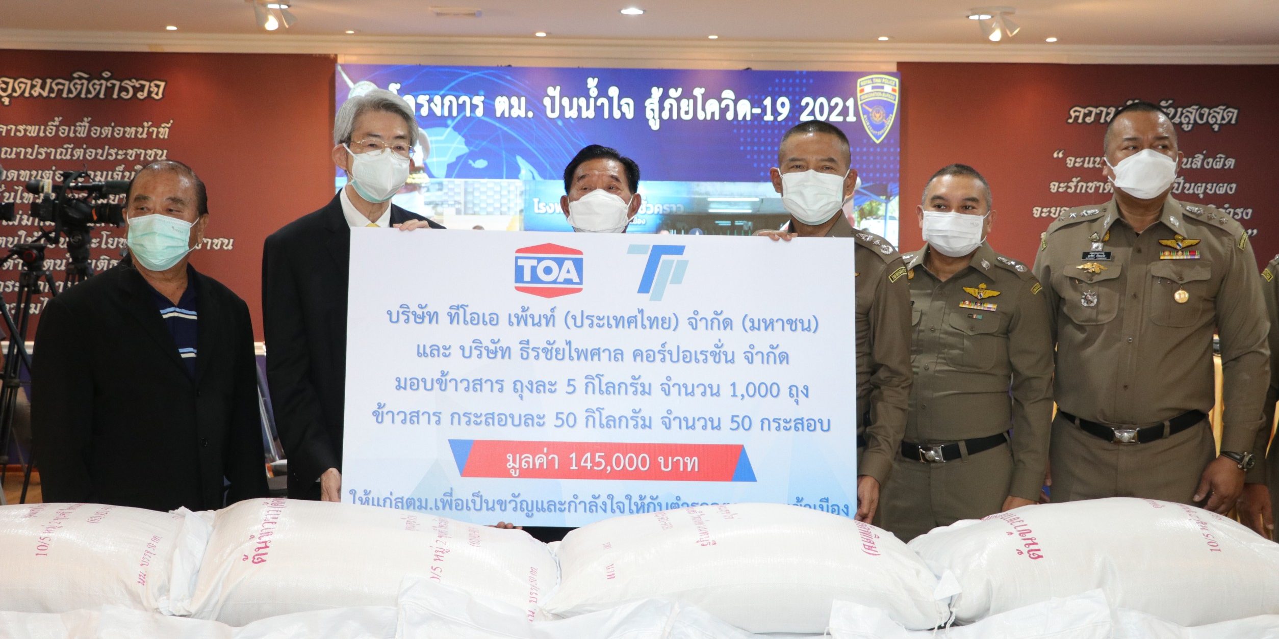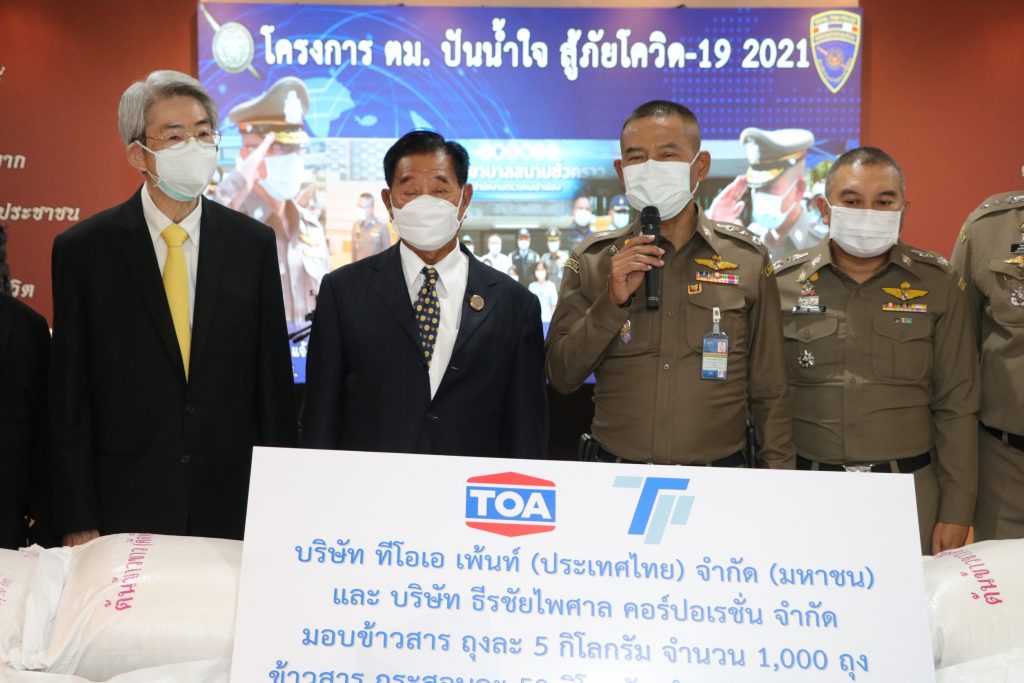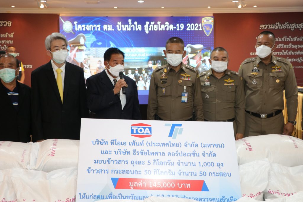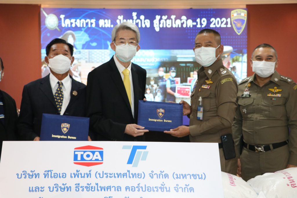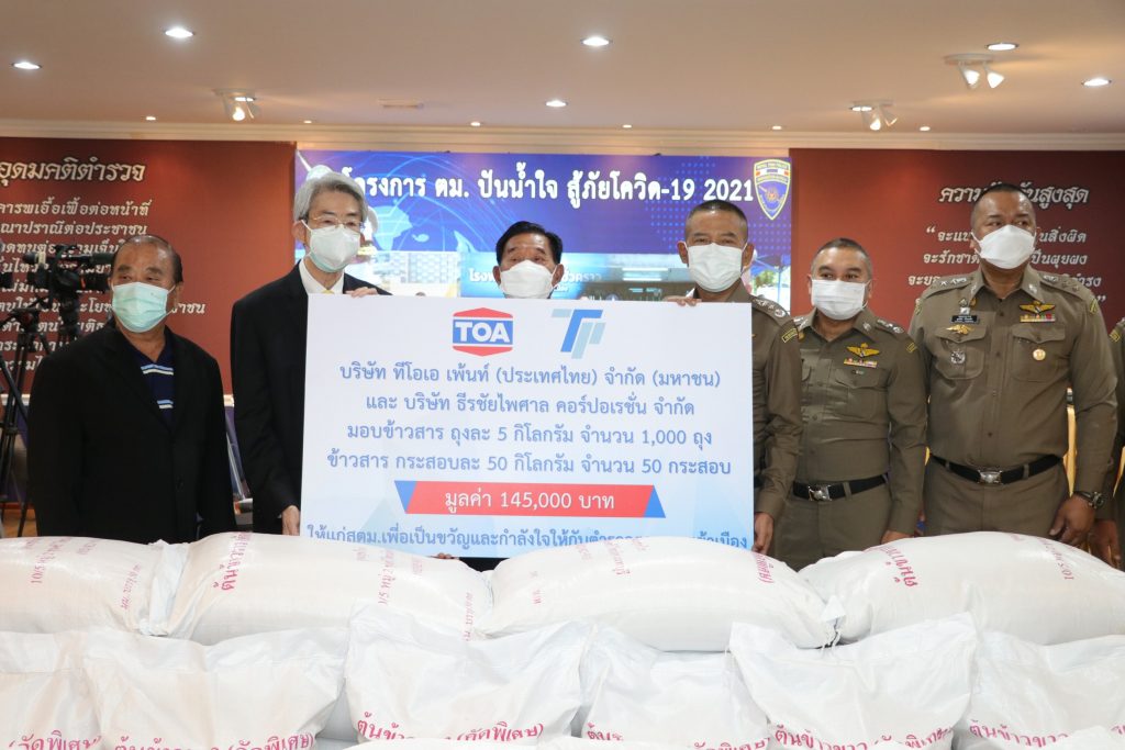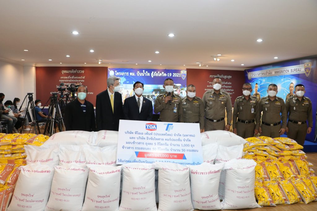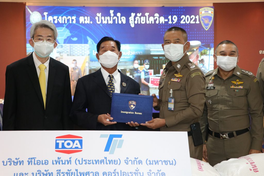 วันที่ 8 ก.ย.64 เวลา 14.00 น.: บริษัท ทีโอเอ เพ้นท์ (ประเทศไทย) จำกัด (มหาชน) โดยคุณประจักษ์ ตั้งคารวคุณ ประธานกรรมการบริหาร และบริษัท ธีรชัยไพศาล คอร์ปอเรชั่น จำกัด โดยคุณกิตติพงษ์ เตรัตนชัย ประธานกรรมการ มอบข้าวสารถุงละ 5 กก. จำนวน 1,000 ถุง ข้าวสารกระสอบละ 50 กก. จำนวน 50 กระสอบ รวมมูลค่า 145,000 บาท เพื่อบำรุงขวัญและกําลังใจให้แก่เจ้าหน้าที่ตำรวจที่ปฏิบัติหน้าที่ในสำนักงานตรวจคนเข้าเมือง โดยมี พล.ต.ท.สมพงษ์ ชิงดวง ผบช.สตม.พร้อมด้วยพล.ต.ต.สิทธิชัย โล่กันภัย,พล.ต.ต.อาชยน ไกรทอง รอง ผบช.สตม.,พ.ต.อ.ศุภชัชจ์ เปี่ยมมนัส รอง ผบก.ตม.6,พ.ต.อ.เศรษฐภัทร ณ สงขลา ผกก.สส.บก.ตม.5,พ.ต.อ.สมชาย จิตสงบ ผกก.ตม.จ.ระนอง และ พ.ต.ท.สุชาติ เพ็ญภู่ รอง ผกก.ตม.จ.ตาก เป็นผู้รับมอบ ซึ่งจะนำไปแจกจ่ายให้กับข้าราชการตำรวจในสังกัดต่อไป