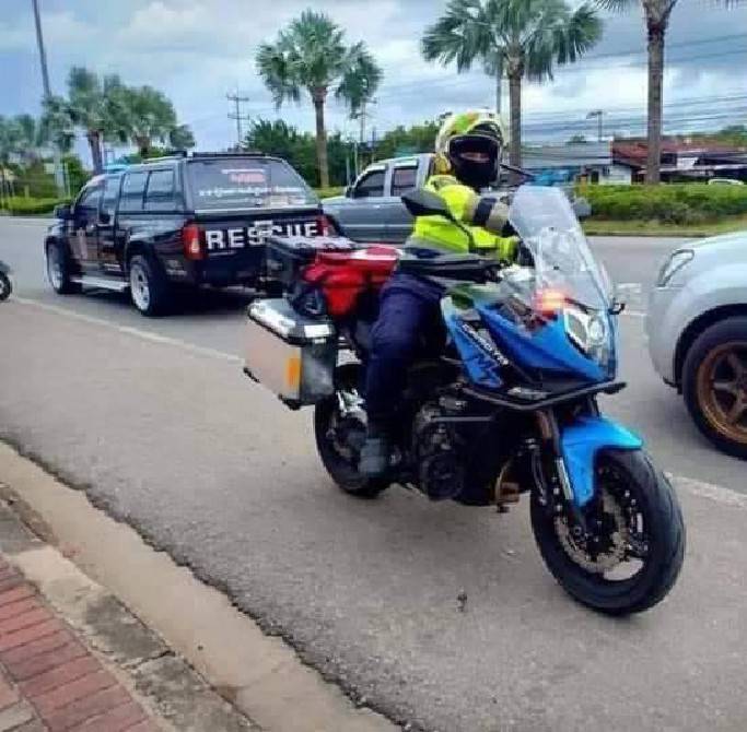 น้ำเงิน ดำ ขนาด 650 ซีซี หมายเลขทะเบียน ที่ใช้เป็นรถกู้ชีพ คอยวิ่งช่วยเหลือผู้ประสบอุบัติเหตุ และเหตุฉุกเฉิน เหตุเกิดที่บริเวณด้านหน้าบ้านพัก เลขที่ 105/1 ม.11 ต.หนองปรือ อ.บางละมุง จ.ชลบุรี หลังเกิดเหตุได้แจ้งความร้องทุกข์กับพนักงานสอบสวน สภ.หนองปรือแล้ว