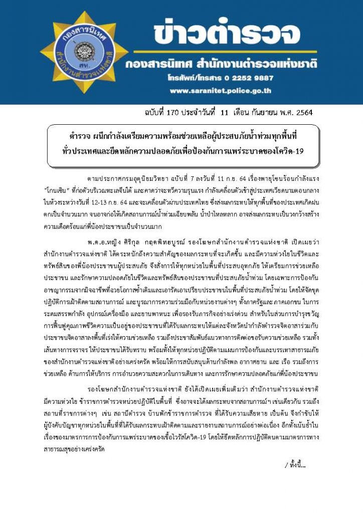 พ.ต.อ.หญิง ศิริกุล กฤตพิทยบูรณ์ รองโฆษกสำนักงานตำรวจแห่งชาติ เปิดเผยว่าสำนักงานตำรวจแห่งชาติ ได้ตระหนักถึงความสำคัญของผลกระทบที่จะเกิดขึ้น และมีความห่วงใยในชีวิตและทรัพย์สินของพี่น้องประชาชนผู้ประสบภัย จึงสั่งการให้ทุกหน่วยในพื้นที่ประสบอุทกภัย ให้เตรียมการช่วยเหลือประชาชน และรักษาความปลอดภัยในชีวิตและทรัพย์สินของประชาชนที่ประสบภัยน้ำท่วม โดยเฉพาะการป้องกันอาชญากรรมจากมิจฉาชีพที่ฉวยโอกาสซ้ำเติมและเอารัดเอาเปรียบประชาชนในพื้นที่ประสบภัยน้ำท่วม โดยให้จัดชุดปฏิบัติการเฝ้าติดตามสถานการณ์ และบูรณาการความร่วมมือกับหน่วยงานต่างๆ
