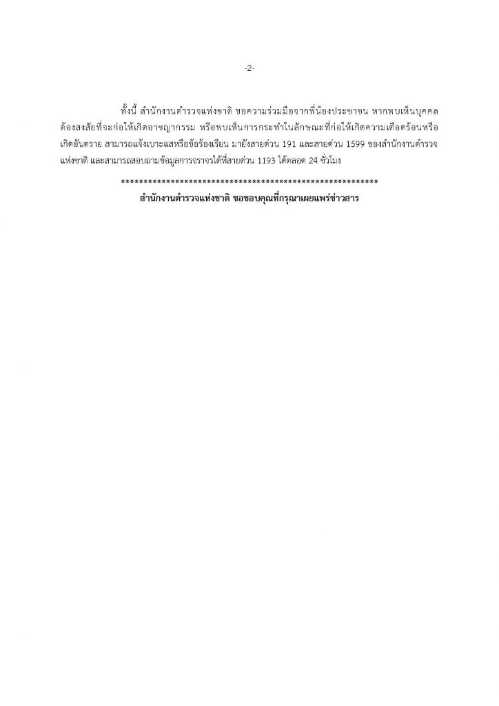 ทั้งนี้ สำนักงานตำรวจแห่งชาติ ขอความร่วมมือจากพี่น้องประชาชน หากพบเห็นบุคคล ต้องสงสัยที่จะก่อให้เกิดอาชญากรรม หรือพบเห็นการกระทำในลักษณะที่ก่อให้เกิดความเดือดร้อนหรือ เกิดอันตราย สามารถแจ้งเบาะแสหรือข้อร้องเรียน มายังสายด่วน 191 และสายด่วน 1599 ของสำนักงานตำรวจแห่งชาติ และสามารถสอบถามข้อมูลการจราจรได้ที่สายด่วน 1193 ได้ตลอด 24 ชั่วโมง