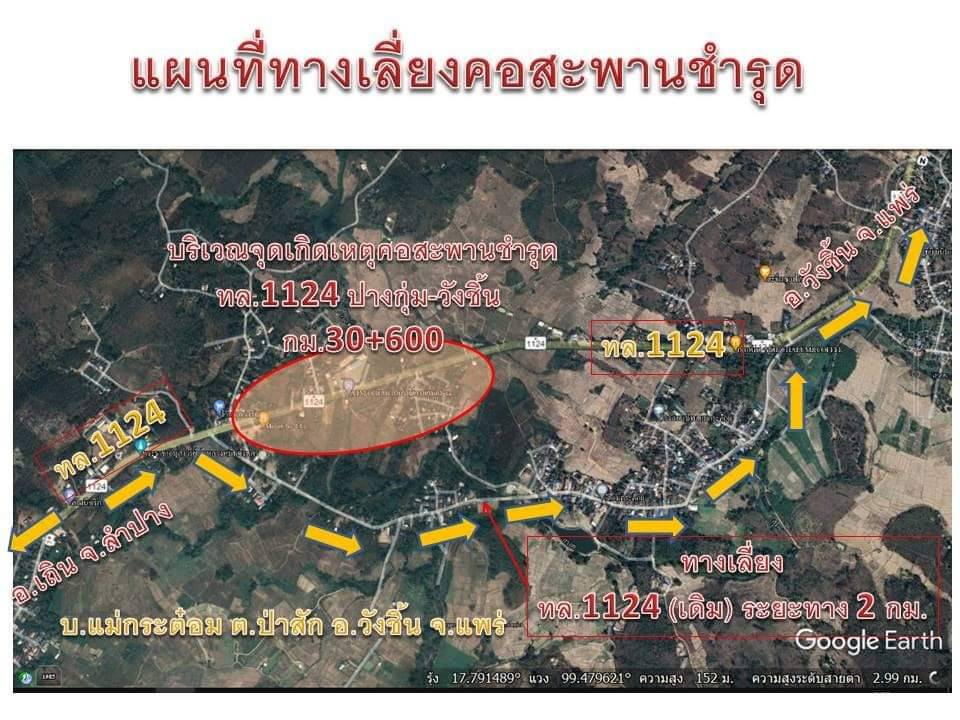 กองบังคับการตำรวจทางหลวง ขอรายงานสถานการณ์น้ำท่วมบนทางหลวง กรณีเส้นทางหลวง 1124 ปางกุ่ม-วังชิ้น อำเภอวังชิ้น จ.แพร่ ช่วง กม.ที่ 30+685 น้ำป่าไหลหลาก กัดเซาะ ทำให้เกิดโพรงใต้แผ่นพื้นสะพาน เส้นทางการจราจรหลักไม่สามารถสัญจรผ่านได้ นั้น