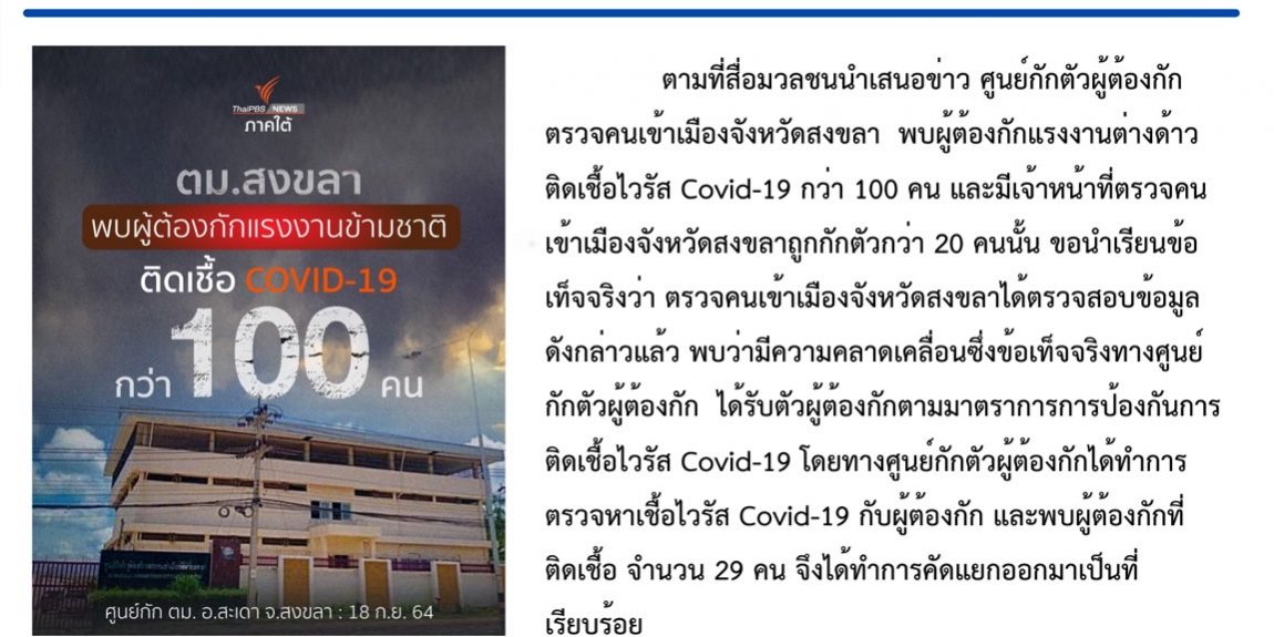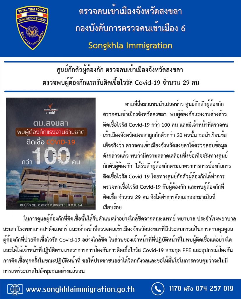 ตามที่มีสื่อมวลชนนำเสนอข่าวศูนย์กักตัวผู้ต้องกัก ตรวจคนเข้าเมืองจังหวัดสงขลา พบผู้ต้องกักแรงงานต่างด้าวติดเชื้อไวรัส Covid-19 กว่า 100 คน และมีเจ้าหน้าที่ตรวจคนเข้าเมืองจังหวัดสงขลา ถูกกักตัวกว่า 20 คน นั้น ขอนำเรียนข้อเท็จจริงว่า ตรวจคนเข้าเมืองจังหวัดสงขลา ได้ตรวจสอบข้อมูลดังกล่าวแล้ว พบว่ามีความคลาดเคลื่อน ซึ่งข้อเท็จจริงทางศูนย์กักตัวผู้ต้องกักได้รับตัวผู้ต้องกักตามมาตราการการป้องกันการติดเชื้อไวรัส Covid-19