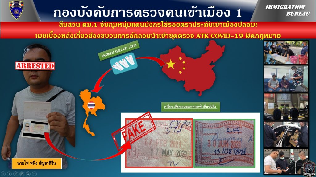 สืบเนื่องมาจาก กองกำกับการสืบสวน กองบังคับการตรวจคนเข้าเมือง 1 ร่วมกับ กองกำกับการ 1 กองบังคับการปราบปรามการกระทำผิดเกี่ยวกับการค้ามนุษย์ ได้ร่วมกันทำการสืบสวนและทราบข้อมูลจากสายลับว่า มีชายชาวจีนซึ่งมีพฤติการณ์เกี่ยวข้อง กับขบวนการลักลอบนำเข้าชุดตรวจ ATK COVID-19 ผิดกฎหมายจากประเทศจีนเข้ามาในประเทศไทย และอยู่ในราชอาณาจักรโดยผิดกฎหมาย หลบซ่อนตัวอยู่แถวบริเวณ เขตบางบอน กรุงเทพมหานคร เจ้าหน้าที่จึงได้จัดกำลังสืบสวนติดตามตัวบุคคลต่างด้าวสัญชาติจีนดังกล่าว
