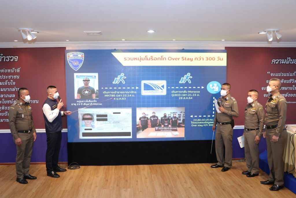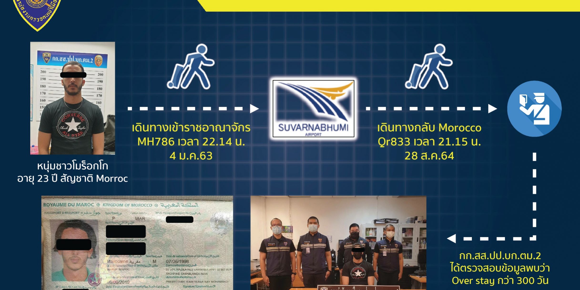 โดยผู้ถูกจับกุมเป็นชาย สัญชาติโมร็อคโค อายุประมาณ 23 ปี ได้รอที่โถงผู้โดยสารเพื่อรอการเช็คอินและเดินทางออกนอกราชอาณาจักรไทยไปยังประเทศรัสเซีย โดยสายการบินกาตาร์แอร์ไลน์ เที่ยวบิน QR833 ขณะที่เจ้าหน้าที่ชุดตรวจได้เดินตรวจตราความสงบเรียบร้อย จึงได้ขอสุ่มตรวจเอกสารและหนังสือเดินทางของผู้โดยสาร และส่งข้อมูลให้เจ้าหน้าที่ กก.สส.ปป.บก.ตม.2 ตรวจข้อมูลเพิ่มเติมจากระบบสารนิเทศสำนักงานตรวจคนเข้าเมือง (BIOMETRIC) และ APPS พบข้อมูลการเข้ามาในราชอาณาจักรของชายสัญชาติโมร็อคโค โดยสารสายการบินมาเลเซียแอร์ไลน์ เที่ยวบิน MH786 ซึ่งอยู่ในราชอาณาจักรเกินกำหนดอนุญาต จำนวน 300 วัน ตรงกับข้อมูลในหนังสือเดินทาง และชายสัญชาติโมร็อกโก ไม่มีเงินเพียงพอในการจ่ายค่าปรับ จึงได้ดำเนินการจับกุมส่ง พงส.สภ.ท่าอากาศยานสุวรรณภูมิ เพื่อดำเนินการตามกฎหมายต่อไป