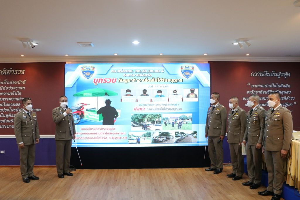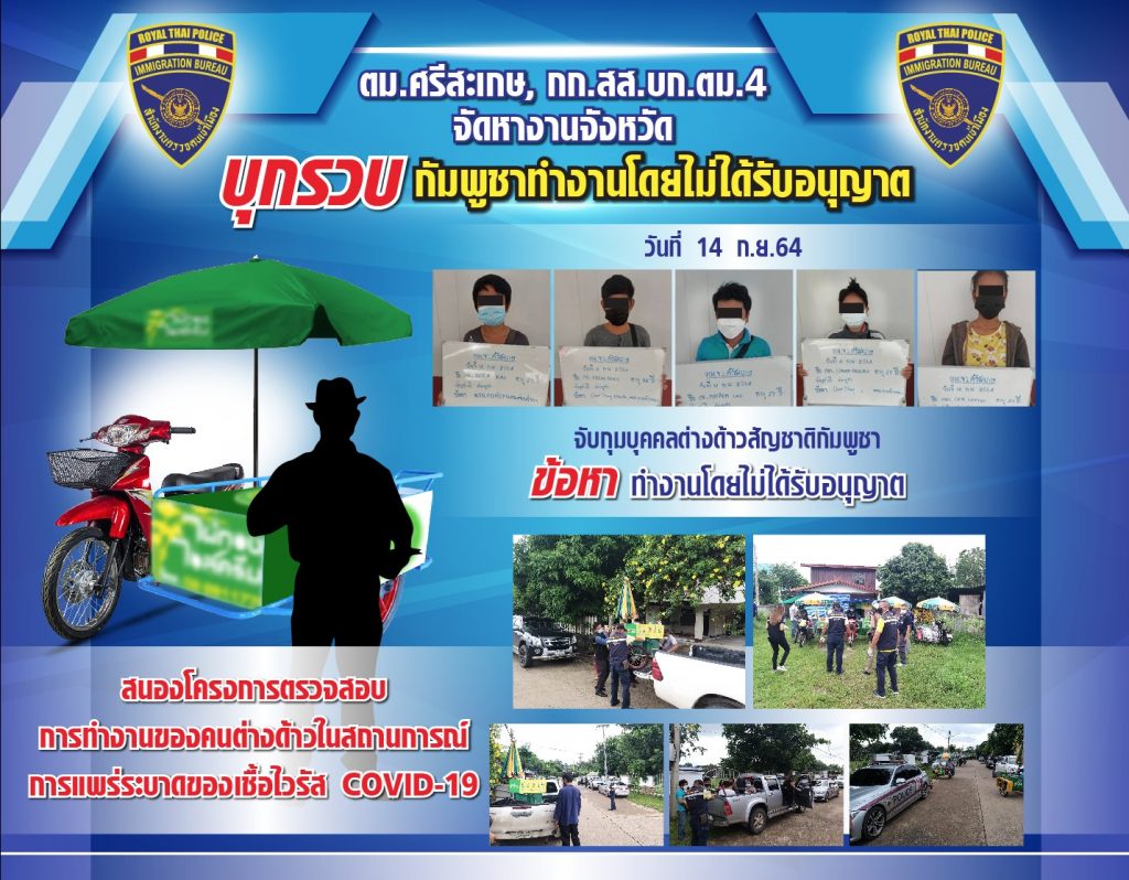 กก.สส.บก.ตม.4 ร่วมกับ ตม.จ.ศรีสะเกษ จับกุมบุคคลต่างด้าวสัญชาติกัมพูชา จำนวน 5 ราย กระทำผิดฐาน “เป็นคนต่างด้าว ทำงานโดยไม่มีในอนุญาตทำงาน หรือนอกเหนือจากสิทธิที่จำทำได้ ตาม พ.ร.ก.การบริหารจัดการการทำงานของคนต่างด้าว พ.ศ.2560 และที่แก้ไขเพิ่มเติม ฉบับที่ 2 พ.ศ.2561” โดยในจำนวนนั้น มีคนต่างด้าวจำนวน 4 ราย กระทำผิดฐาน “เป็นคนต่างด้าวเข้ามาและอยู่ในราชอาณาจักรโดยการอนุญาตสิ้นสุด (OVERSTAY)” โดยสามารถจับกุมได้บริเวณ ริมถนนสาธารณะหน้าโรงเรียนเทศบาล 6 (โรงเรียนโนนสำนัก) ต.หนองหญ้าปล้อง อ.เมือง จ.ศรีสะเกษ