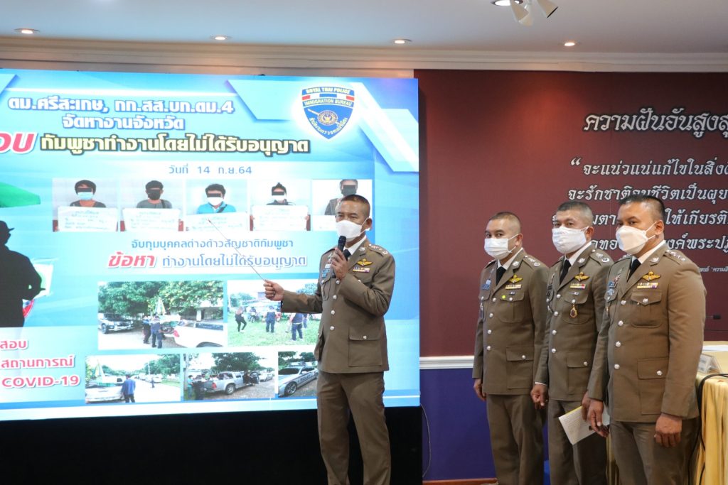 วันที่ 27 ก.ย.64 เวลา 14.00 น.ณ ห้องอเนกประสงค์ ชั้น 1 อาคาร 1 สตม.ซ.สวนพลู แขวงทุ่งมหาเมฆ เขตสาทร กรุงเทพมหานคร : พล.ต.ท.สมพงษ์ ชิงดวง ผบช.สตม.และ พล.ต.ต.อาชยน ไกรทอง รอง ผบช.สตม. ได้สั่งการให้ พล.ต.ต.กฤษฎา กาญจนอลงกรณ์ ผบก.ตม.4,พ.ต.อ.เอกกมนต์ พรชูเกียรติ,พ.ต.อ.วีรยศ การุณยธร,พ.ต.อ.ปรีชา กองแก้ว รอง ผบก.ตม.4 และ พ.ต.อ.อาทิตย์ ซึมดอน ผกก.ตม.จ.ศรีสะเกษ ร่วมแถลงข่าวจับกุมผู้ต้องหา ชาวกัมพูชา ลักลอบทำงานโดยไม่ได้รับอนุญาต
