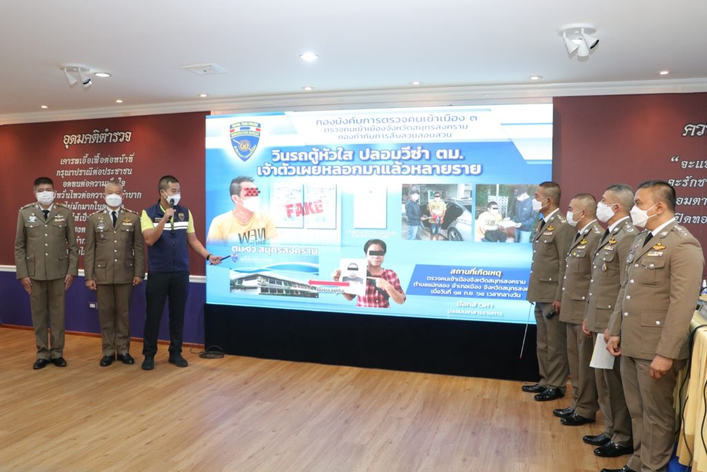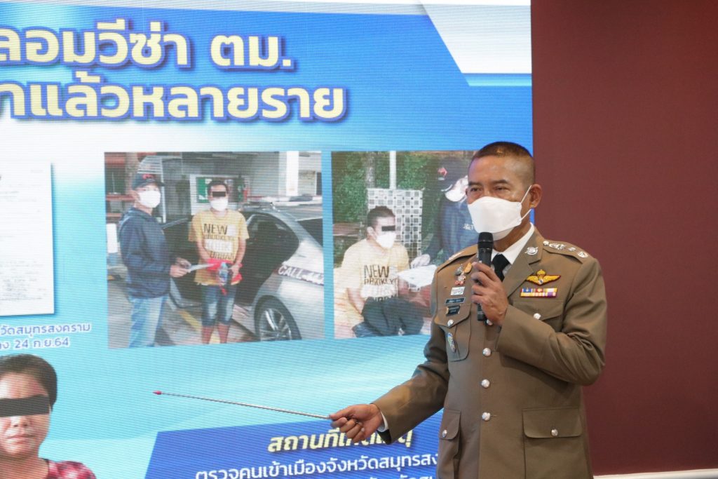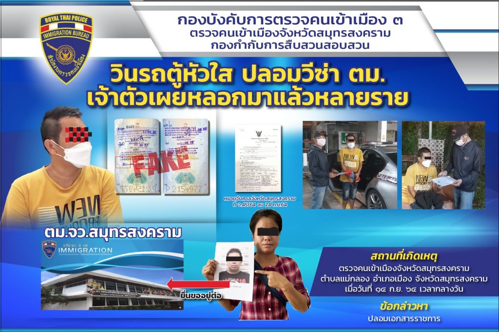เจ้าหน้าที่ ตม.จ.สมุทรสงคราม ได้ตรวจพบว่ามีผู้เสียหายรายหนึ่ง เป็นบุคคลต่างด้าวสัญชาติลาว ได้ว่าจ้างนายหน้าให้ดำเนินการต่อวีซ่าให้แต่ปรากฏภายหลังว่าวีซ่านั้นตราประทับไม่ถูกต้อง ชุดสืบสวนตม.จ.สมุทรสงครามจึงได้ร่วมกับกก.สส.บก.ตม.3 ทำการสืบสวนจนทราบว่าผู้ต้องหาซึ่งรับเป็นนายหน้าดำเนินการรายนี้คือ นายพันธมิตร (ขอสงวนนามสกุล) อายุ 46 ปี มีอาชีพหลักเป็นพนักงานขับรถตู้โดยสาร ชุดสืบสวนได้รวบรวมพยานหลักฐานและประสานงานร้อยเวรสอบสวน จนต่อมาสามารถดำเนินการออกหมายจับศาลจังหวัดสมุทรสงคราม ที่ จ.45/2564 ลงวันที่ 23 ก.ย.64 ซึ่งต้องหาฐานความผิด “ปลอมเอกสารราชการ” ไว้ได้