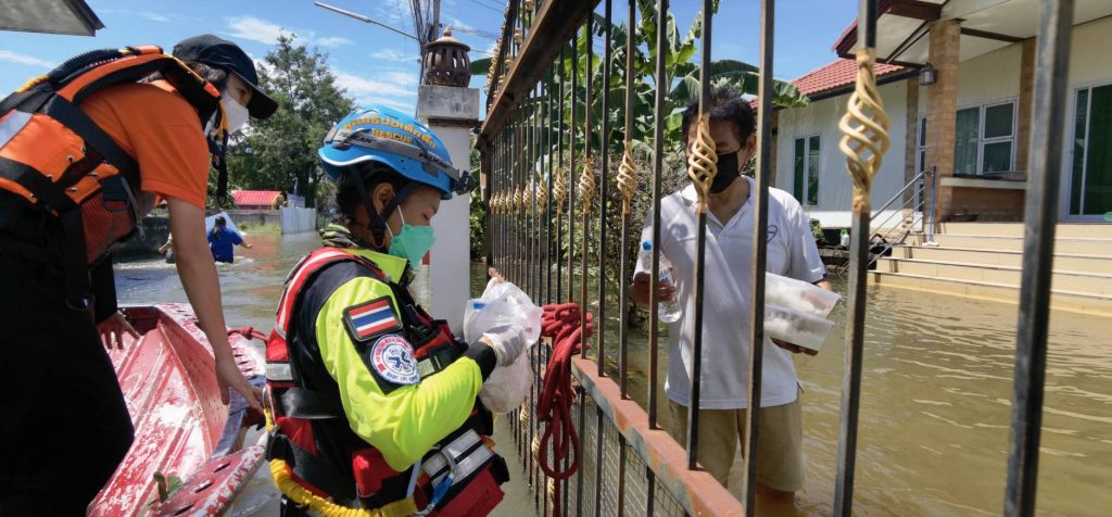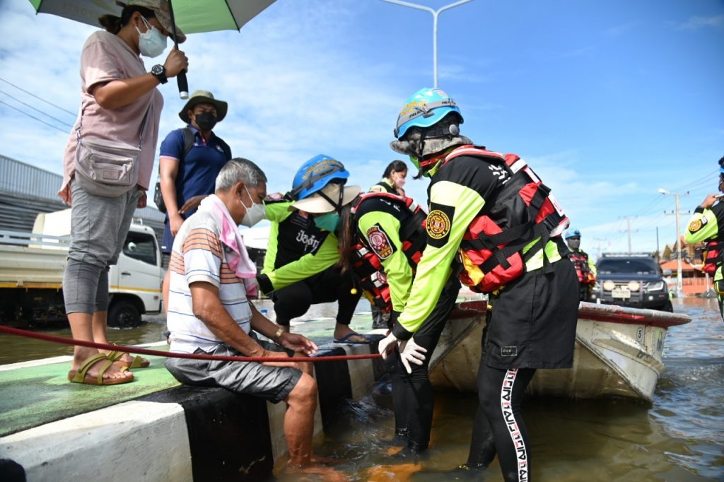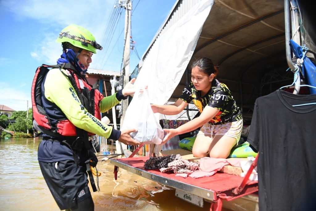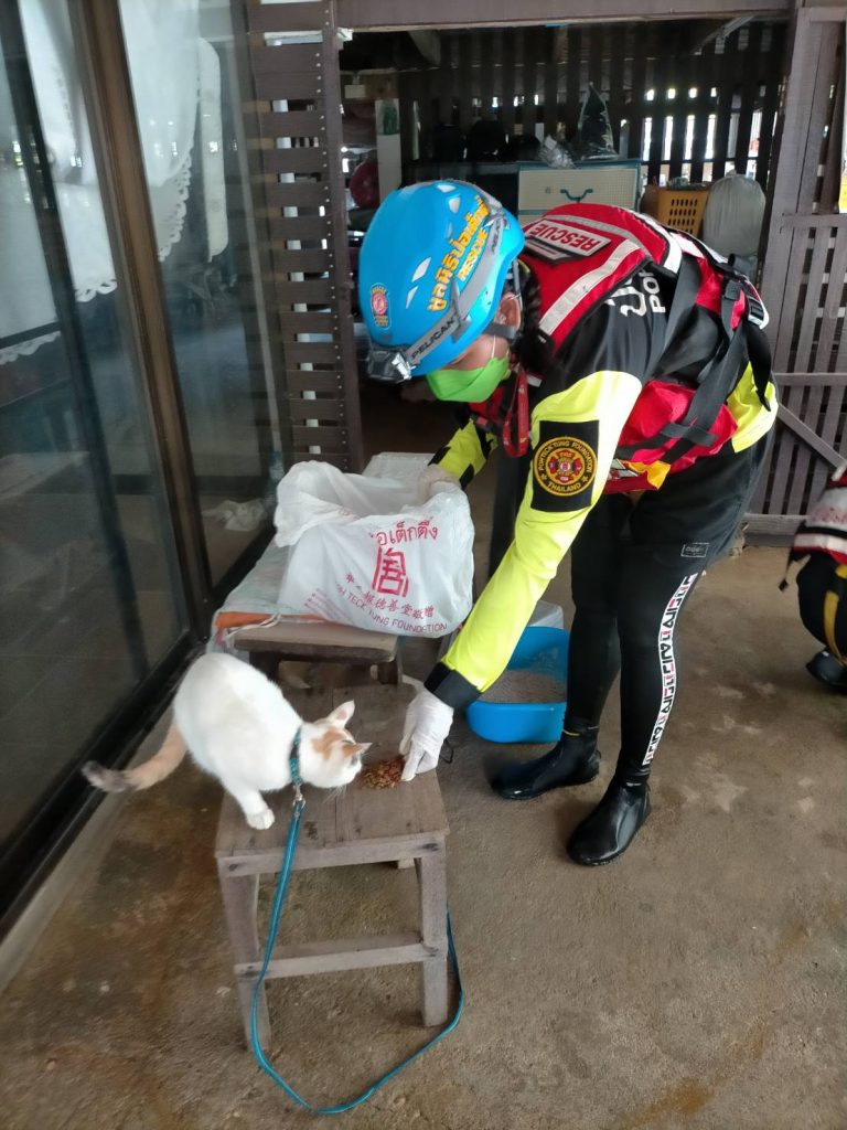 ต.ธานี อ.เมือง จ.สุโขทัย ประกอบอาหารปรุงสุกบรรจุกล่อง พร้อมน้ำดื่ม จำนวน 2 มื้อ รวมจำนวน 3,950 ชุด พร้อมชุดยาเวชภัณฑ์ และอาหารสุนัขและแมวจำนวนหนึ่ง ลงพื้นที่แจกจ่ายแก่ผู้ประสบภัยในพื้นที่ หมู่ 1, 2, 5 ,6, 11, 13 และ 14 ตำบลบ้านกล้วย อำเภอเมือง จังหวัดสุโขทัย รวมทั้งจัดทีมกู้ภัย กู้ชีพ และอาสาสมัคร เร่งอพยพผู้ประสบภัย รวมทั้งสนับสนุนกำลังพล และเรือท้องแบนแก่นางสาวพัชรอร วงศ์กำแหง รองผู้ว่าราชการจังหวัดสุโขทัย และคณะมูลนิธิอาสาเพื่อนพึ่ง (ภาฯ) ยามยาก สภากาชาดไทย นำอาหารปรุงสุกบรรจุกล่องออกแจกจ่ายช่วยเหลือแก่ผู้ประสบภัยในพื้นที่