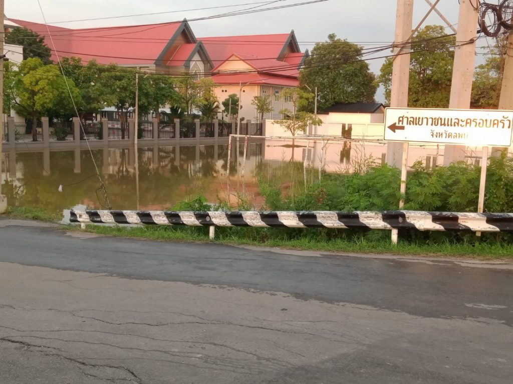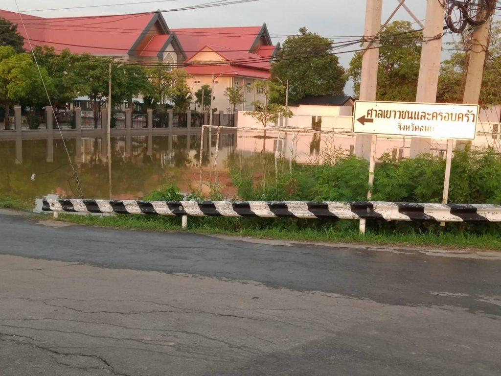 น้ำจากคลองชลประทานชัยนาทป่าสัก ได้ล้นตลิ่งไหลเข้าบริเวณ ลานจอดรถหน้า ศาลเยาวชนและครอบครัวจังหวัดลพบุรี ตำบลป่าตาล อำเภอเมือง จังหวัดลพบุรี ประมาณ 1 เซนติเมตร