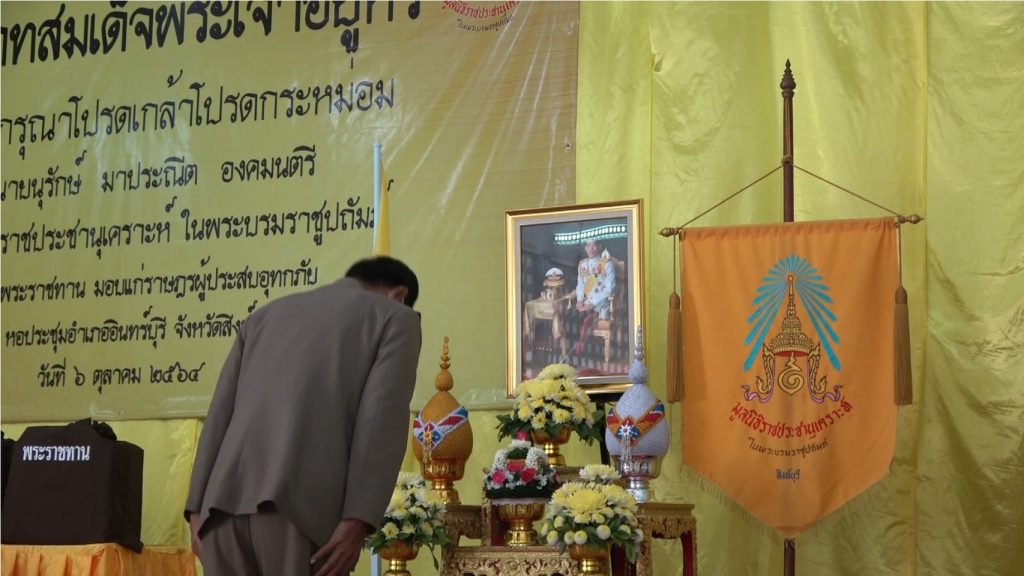 ในการนี้ พระบาทสมเด็จพระเจ้าอยู่หัวทรงพระกรุณาโปรดเกล้าโปรดกระหม่อม ให้นายนุรักษ์ มาประณีต องคมนตรี ร่วมกับมูลนิธิราชประชานุเคราะห์ ในพระบรมราชูปถัมภ์ เชิญสิ่งของพระราชทานเครื่องอุปโภคบริโภคไปมอบแก่ประชาชนผู้ประสบอุทกภัยพื้นที่จังหวัดสิงห์บุรีจำนวน 1,195 ชุด เพื่อบรรเทาความเดือดร้อนของประชาชนในเบื้องต้นพร้อมอัญเชิญกระแสพระราชดำรัสความห่วงใยจากพระบาทสมเด็จพระเจ้าอยู่หัว โดยมี นายชัยชาญ สิทธิวิรัชธรรม ผู้ว่าราชการจังหวัดสิงห์บุรี รักษาการปลัดจังหวัดสิงห์บุรี นายอำเภออินทร์บุรี และหัวหน้าส่วนราชการ เป็นผู้แทนประชาชนรับมอบสิ่งของพระราชทานเครื่องอุปโภคบริโภคและร่วมสำนึกในพระมหากรุณาธิคุณ