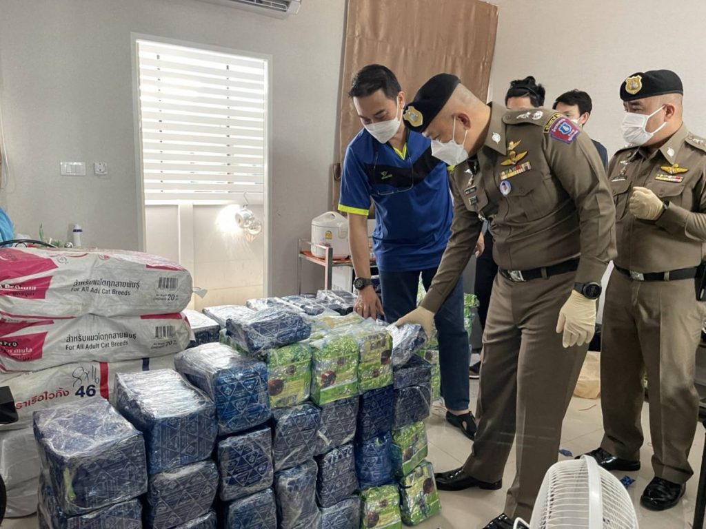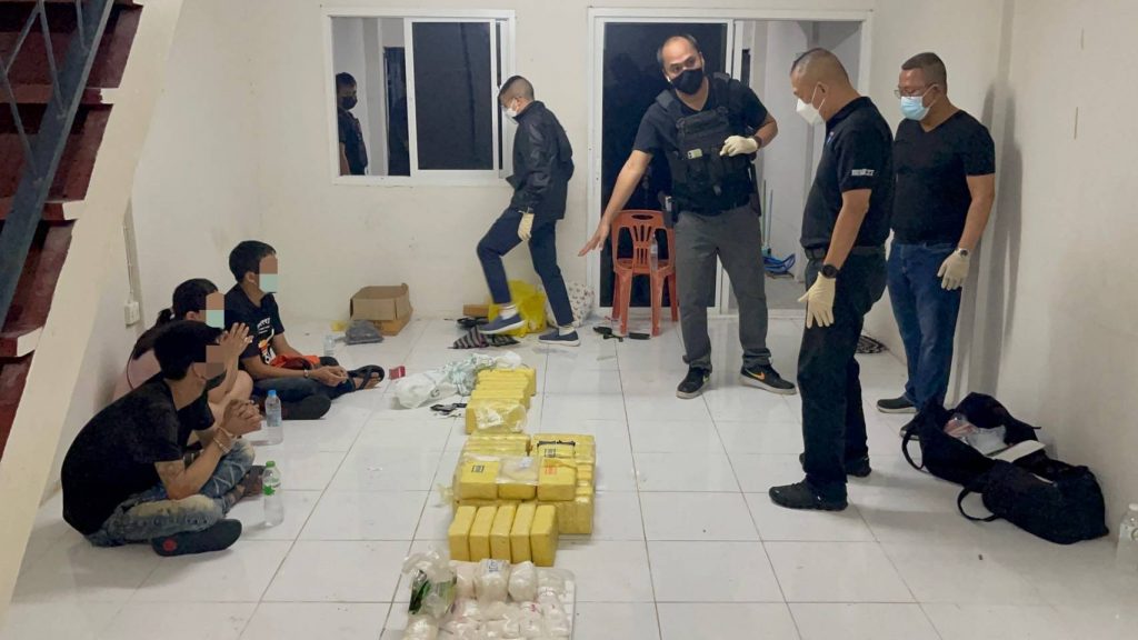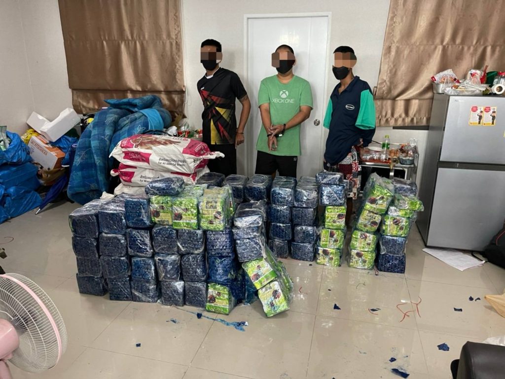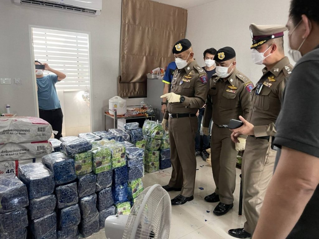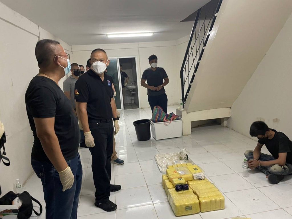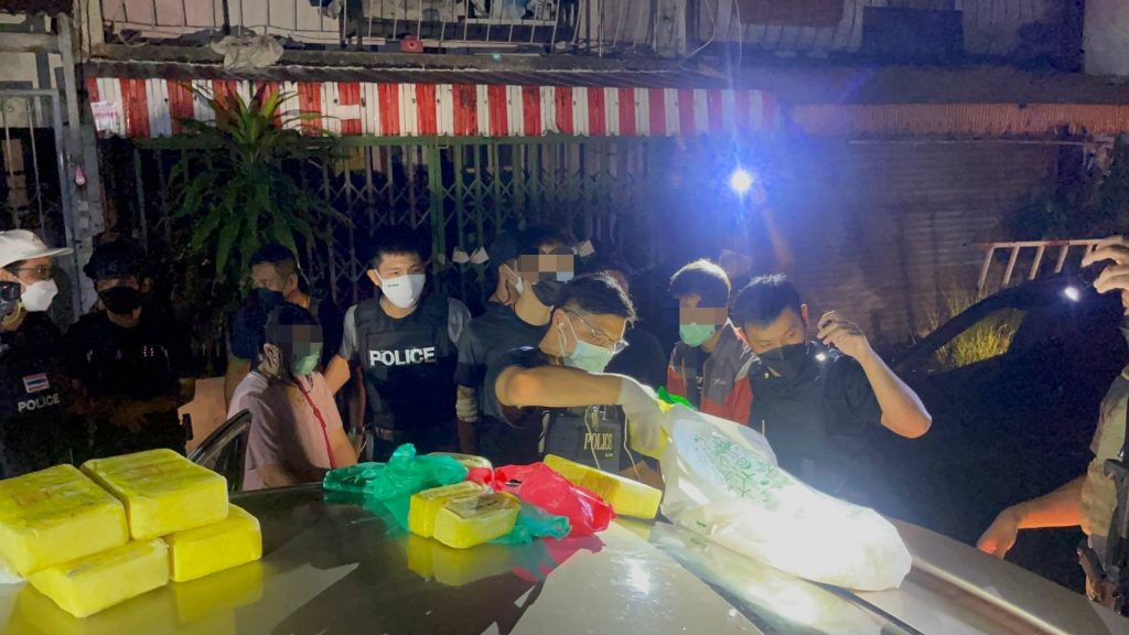 ต่อมาวันที่ 5 ต.ค.64 เจ้าหน้าที่ตำรวจ 191 ได้เฝ้าสังเกตการณ์อยู่ที่บริเวณบ้านเลขที่ดังกล่าว และเมื่อเวลาประมาณ 04.00 น. พบรถยนต์กระบะ ยี่ห้อ Ford Ranger สีเทา หมายเลขทะเบียน 1 ฒภ 7257 กทม. ขับออกจากบ้านพัก จนกระทั่งเวลาประมาณ 06.00 น. รถยนต์กระบะได้ขับกลับเข้ามายังบ้านพัก จากนั้นผู้ต้องหาทั้ง 3 คน ได้ช่วยกันยกกระสอบลงมาจากรถยนต์กระบะ เจ้าหน้าที่ตำรวจจึงเข้าไปแสดงตัวจับกุม และตรวจค้นพบว่าภายในกระสอบนั้นคือยาเสพติดประเภท 1 (ไอซ์) น้ำหนักกว่า 400 กิโลกรัม จากนั้นได้เข้าตรวจค้นภายในบ้านพักยังพบยาเคตามีน จำนวน 160 กก. และยาอี จำนวน 40 เม็ด สอบถามผู้ต้องหาทั้ง 3 คน รับว่าขับรถยนต์กระบะออกไปรับยาไอซ์ที่ย่านบางปะอิน โดยมีนายต้น (ไม่ทราบชื่อสุกลจริง) ที่อยู่ฝั่งประเทศเพื่อนบ้านเป็นผู้สั่งการให้ไปรับยาเสพติดมาจากย่านบางปะอิน จากนั้นนายต้นจะแจ้งว่าให้ไปส่งให้กับลูกค้าตามสถานที่ที่นายต้นแจ้ง ส่วนใหญ่เป็นเป็นย่าน ถ.กาญจนา ได้ค่าจ้างครั้งละ 50,000–100,000 บาท ต่อครั้ง และทำมาแล้ว 3 ครั้ง