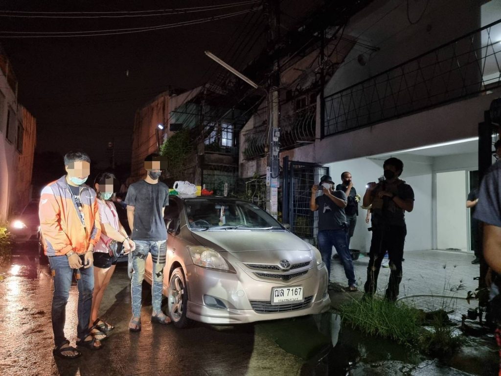 ต่อมาวันที่ 5 ต.ค.64 เวลาประมาณ 20.00 น. พบรถยนต์เก๋ง โตโยต้าวีออส คันทะเบียน ฌล-7167 กทม. ขับมาจอดที่บ้านหลังดังกล่าว จากนั้นผู้ต้องหาทั้งสามคนได้เข้าไปในบ้านพักสักครู่ได้ถือสิ่งของที่เชื่อว่าเป็นยาเสพติดออกมาจากบ้านพัก เจ้าหน้าที่ตำรวจ 191 จึงได้เข้าเเสดงตัวขอตรวจค้น ผลการตรวจค้นพบยาบ้าจำนวน 90,000 เม็ด อยู่ภายในรถยนต์ จากนั้นได้ตรวจสอบภายในบ้านพักยังพบยาบ้าอีกจำนวน 284,000 เม็ด และยาไอซ์ จำนวน 7 กก. จึงได้เเจ้งข้อกล่าวหา เเละสิทธิ์ให้ทราบ จากนั้นนำตัวมาที่ กก.สายตรวจ บก.สปพ. เพื่อจัดทำบันทึกจับกุม นำส่ง พงส.บช.ปส. ดำเนินคดีตามกฎหมายต่อไป