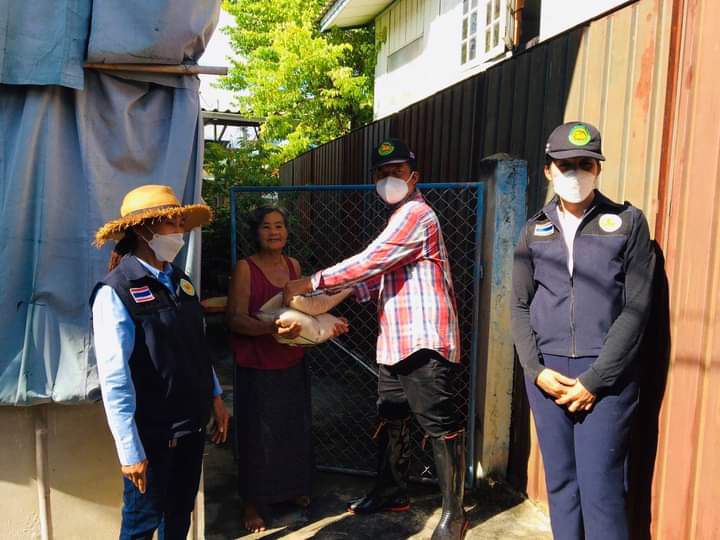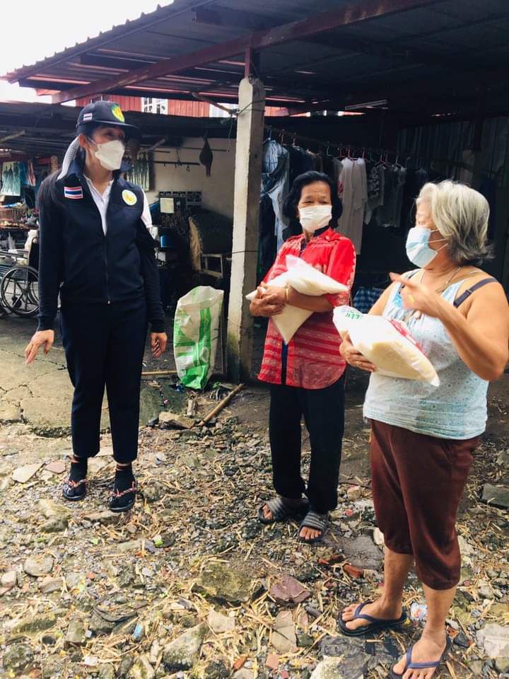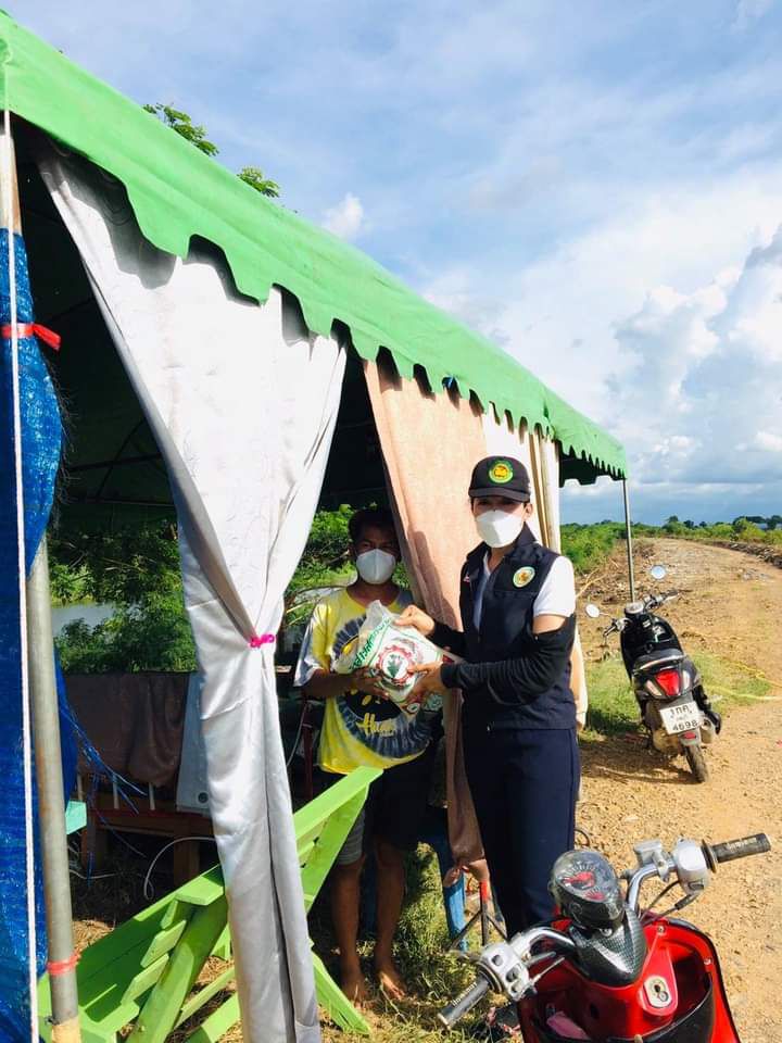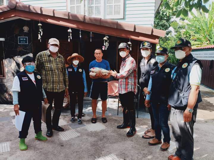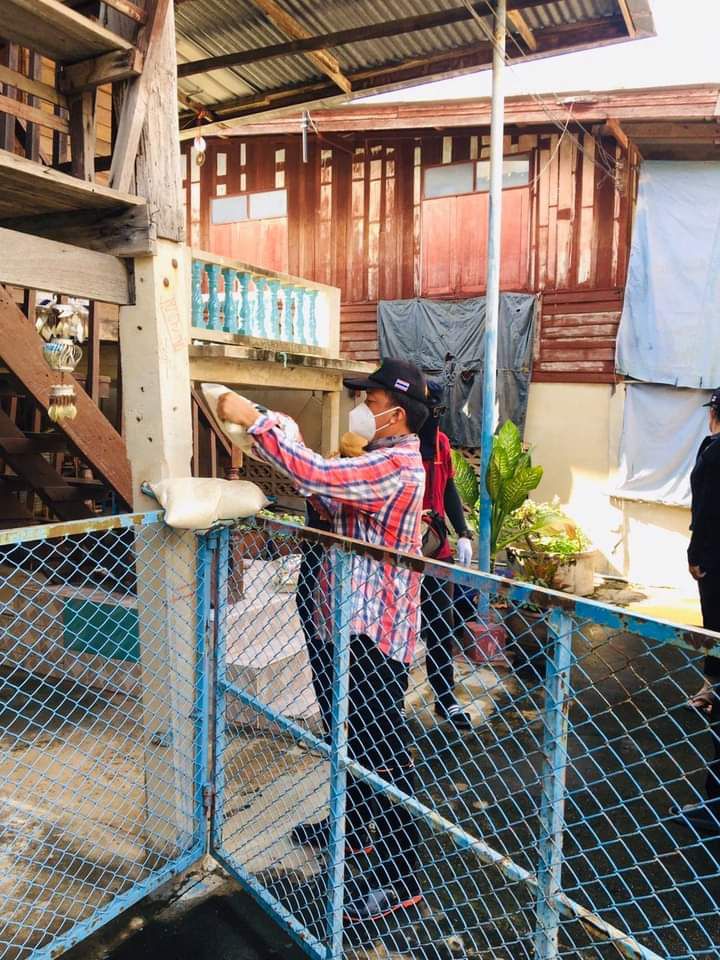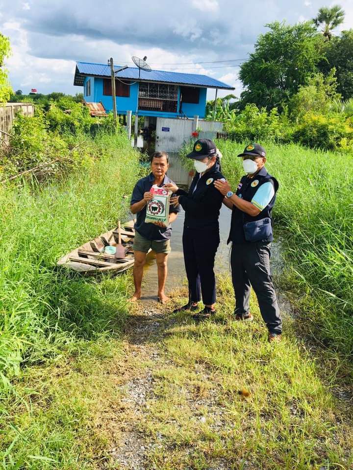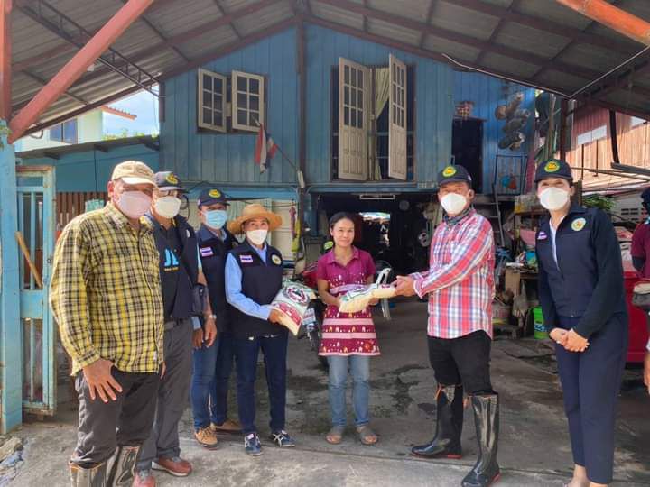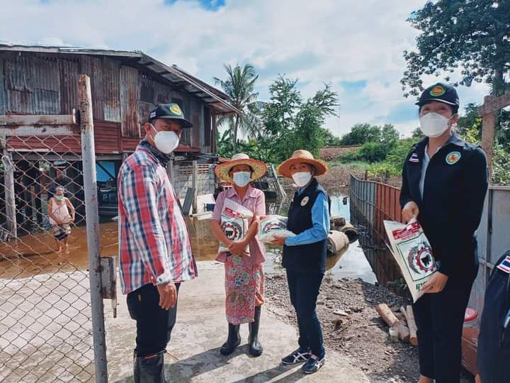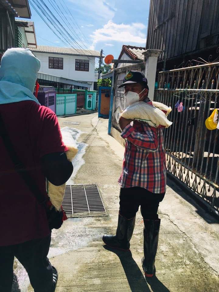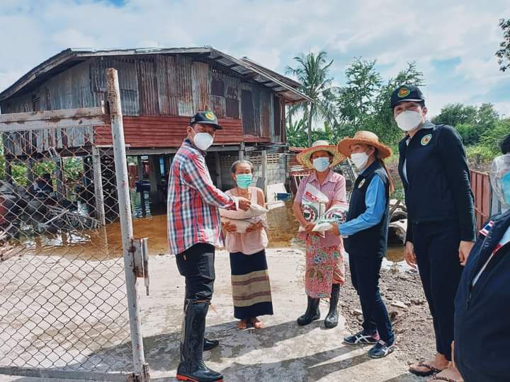 ลุยน้ำแจกถุงยังชีพให้แก่ชาวบ้านที่ประสบภัยน้ำท่วม ในพื้นที่ตำบลถนนใหญ่
