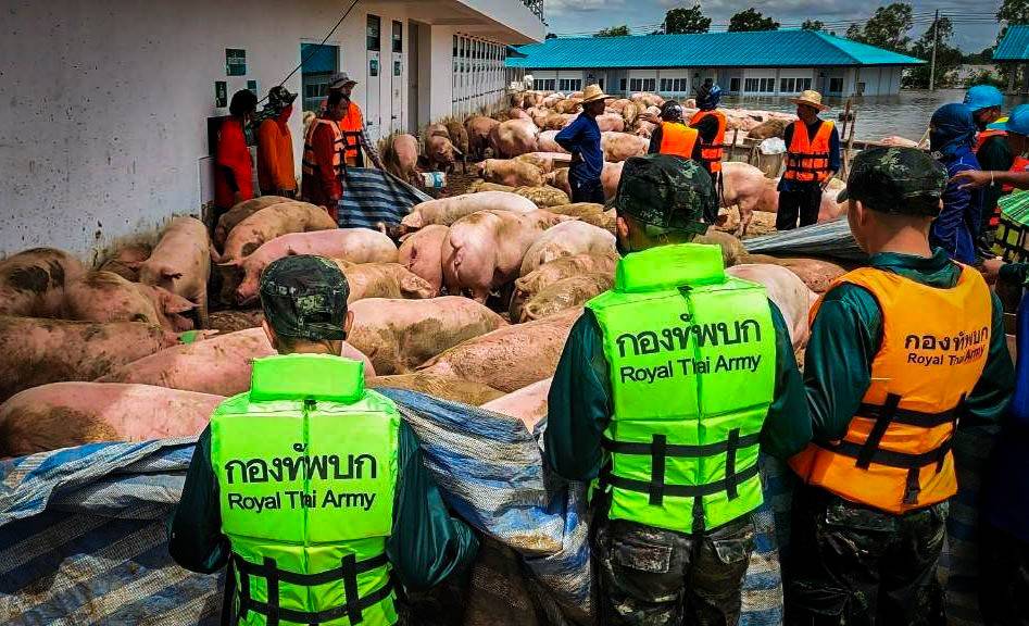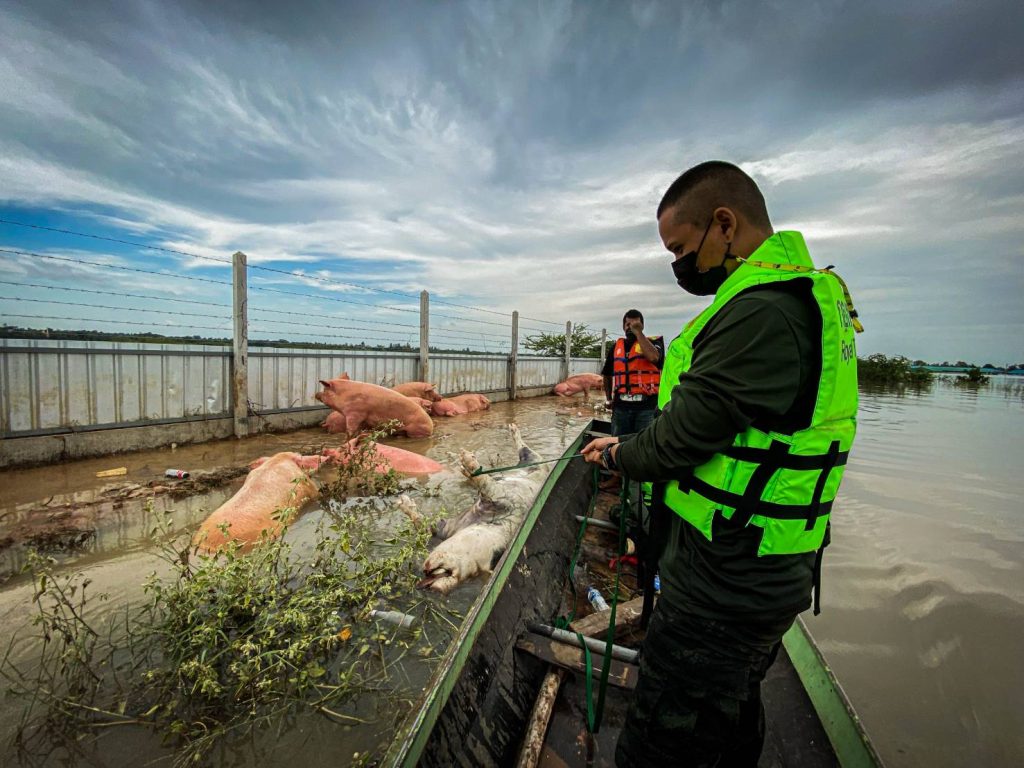 พันเอก ณรงค์ วิชญาณวรวุฒิ ผู้บังคับการกรมทหารราบที่ 8 (ผบ.ร.8) สนองตอบนโยบาย พล.อ.ณรงค์พันธ์ จิตต์แก้วแท้ ผู้บัญชาการทหารบก ให้หน่วยทหารทุกหน่วย สนับสนุนให้การช่วยเหลือประชาชน โดยเฉพาะการระดมทรัพยากร และยุทโธปกรณ์ของกองทัพบกเพื่อใช้ในการบรรเทาสาธารณภัย และช่วยเหลือประชาชนอย่างเต็มศักยภาพอย่างทันท่วงที สั่งการเร่งด่วนให้จัดกำลังพลจิตอาสาของหน่วย กรมทหารราบที่ 8 และ กองพันทหารราบที่ 3 กรมทหารราบที่ 8 ค่ายสีหราชเดโชไชย ต.ศิลา อ.เมือง จ.ขอนแก่น ร่วมกับ เจ้าหน้าที่ป้องกันและบรรเทาสาธารณภัย เข้าขนย้ายหมูออกจากฟาร์ม สถานการณ์น้ำท่วมใน อ.พระยืน จ.ขอนแก่น เข้าสู่วันที่ 2 ระดับน้ำยังสูง 1 เมตร โดยสภาพน้ำที่เข้าท่วมฟาร์ม หมูบางส่วนลอยออกมาจากคอก และเริ่มจมน้ำตาย ซึ่งฟาร์มหมูแห่งนี้ อยู่ติดกับลำน้ำชี เป็นพื้นที่ลุ่มที่เคยถูกน้ำท่วมในปี 2554 แม้ฟาร์มจะทำคันดินโดยรอบเพื่อกั้นน้ำ แต่กระแสน้ำที่ไหลมาจาก จ.ชัยภูมิในปีนี้ ค่อนข้างไหลเร็ว และหลากท่วมทุ่ง จึงไหลเข้าท่วมฟาร์มหมูทุกทิศทาง ไม่สามารถเคลื่อนย้ายออกได้ทัน