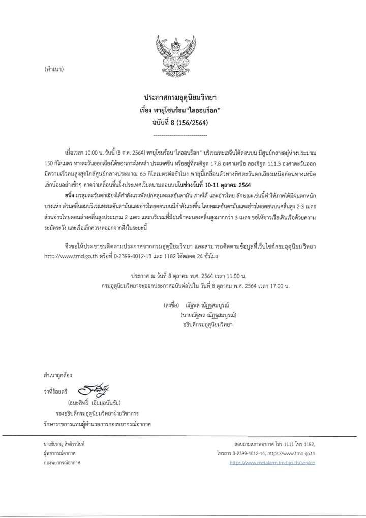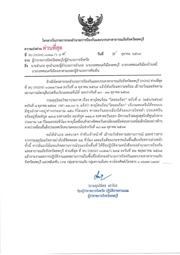 นายศุภภิมิตร เปาริก รองผู้ว่าราชการจังหวัดลพบุรี แจ้งว่า กรมอุตุนิยมวิทยา ได้ออกประกาศ ฉบับที่ 8 เรื่องพายุโซนร้อนกำลังแรง “ไลออนร๊อก” แจ้งว่า เมื่อเวลา 11.00 น.ของวันที่8 ตุลาคม 2564 เมื่อวานนี้