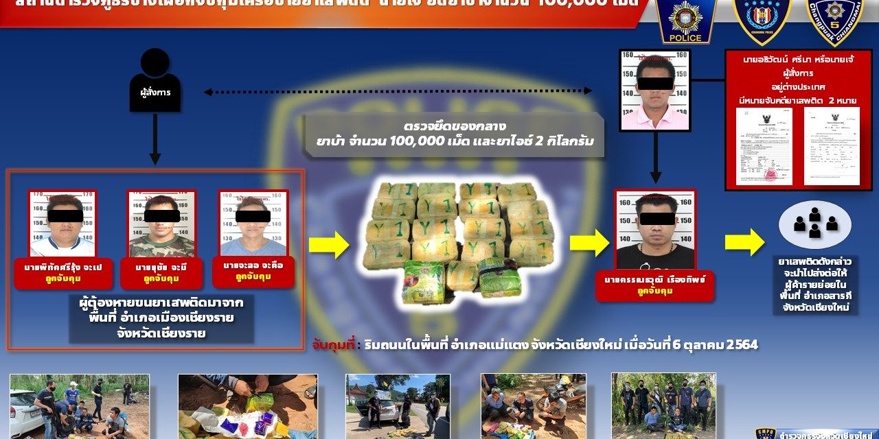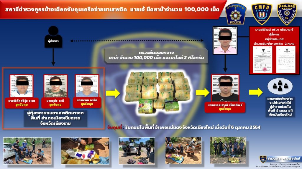 ได้จับกุมตัวผู้ต้องหาทั้งหมด 4 คน คือ นายกรรณธวุฒิ เรืองทิพย์ อายุ 30 ปี ที่อยู่ 249/1 ม.4 ต.สะลวง อ.แม่ริม จ.เชียงใหม่,นายยุชัย จะมี อายุ 30 ปี ที่อยู่ 224 ม.8 ต.ห้วยชมภู อ.เมือง จ.เชียงราย,นายจะลอ จะคือ อายุ 33 ปี ที่อยู่ 298 ม.8 ต.ห้วยชมภู อ.เมือง จ.เชียงราย และนายพิทักศรีรุ้ง จะแป อายุ 33 ปี ที่อยู่ 296 ม.8 ต.ห้วยชมภู อ.เมือง จ.เชียงราย พร้อมด้วยของกลาง ยาเสพติดให้โทษประเภท 1 (ยาบ้า) จำนวน รวมประมาณ 100,000 เม็ด,ยาเสพติดให้โทษประเภท 1 (ไอซ์) น้ำหนักประมาณ 2 กิโลกรัม,รถยนต์เก๋ง ยี่ห้อโตโยต้า รุ่นยาริส สีขาว ทะเบียน งจ 2940 เชียงใหม่ (พบซุกซ่อนอยู่ในช่องเก็บของด้านหลังรถยนต์เก๋งคันดังกล่าว),รถยนต์กระบะหัวเดี่ยว ยี่ห้อโตโยต้า รุ่นเรโว่ สีขาว ไม่ติดแผ่นป้ายทะเบียน และรถจักรยานยนต์ ยี่ห้อฮอนด้า รุ่นเวฟ 110 ไอ สีส้มดำ ไม่ติดแผ่นป้ายทะเบียน โดยกล่าวหาว่า มีความผิดฐาน “ร่วมกันมียาเสพติดให้โทษประเภท 1 (ไอซ์ และยาบ้า) ไว้ในครอบครองเพื่อจำหน่ายโดยผิดกฎหมาย”