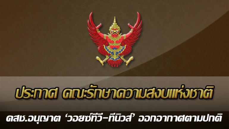 คสช.ออกประกาศ ฉบับที่ 65 อนุญาต ‘วอยซ์ทีวี-ทีนิวส์’ ออกอากาศรายการประจำของสถานีได้ตามปกติ