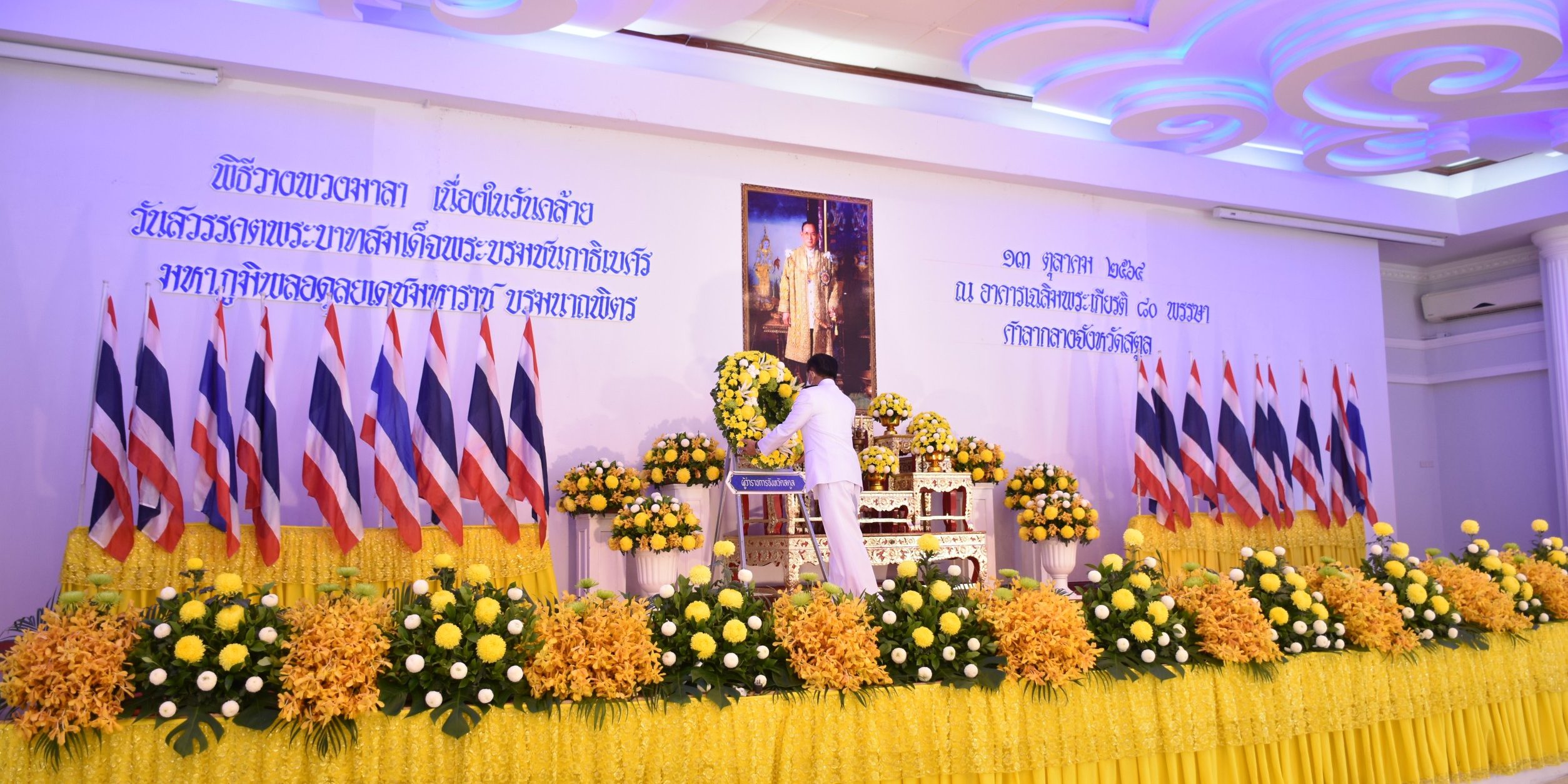 วันนี้ 13 ตุลาคม 2564 เวลา 09.00 น. ที่อาคารเฉลิมพระเกียรติ 80 พรรษา ศาลากลางจังหวัดสตูล นายเอกรัฐ หลีเส็น ผู้ว่าราชการจังหวัดสตูล เป็นประธานในพิธีวางพวงมาลาและกล่าวน้อมรำลึกในพระมหากรุณาธิคุณ เบื้องหน้าพระบรมฉายาลักษณ์ พระบาทสมเด็จพระบรมชนกาธิเบศร มหาภูมิพลอุลยเดช บรมนาถบพิตร เนื่องในวันคล้ายวันสวรรคต 13 ตุลาคม 2564 จากนั้น ผู้ว่าราชการจังหวัดสตูล พร้อมผู้ร่วมพิธียืนสงบนิ่งน้อมรำลึกในพระมหากรุณาธิคุณ เป็นเวลา 89 วินาที โดยมีหัวหน้าส่วนราชการ ข้าราชการ ทหาร ตำรวจ เข้าร่วมพิธี โดยปฏิบัติตามมาตรการการป้องกันการแพร่ระบาดของโรคติดเชื้อไวรัสโคโรนา 2019 อย่างเคร่งครัด