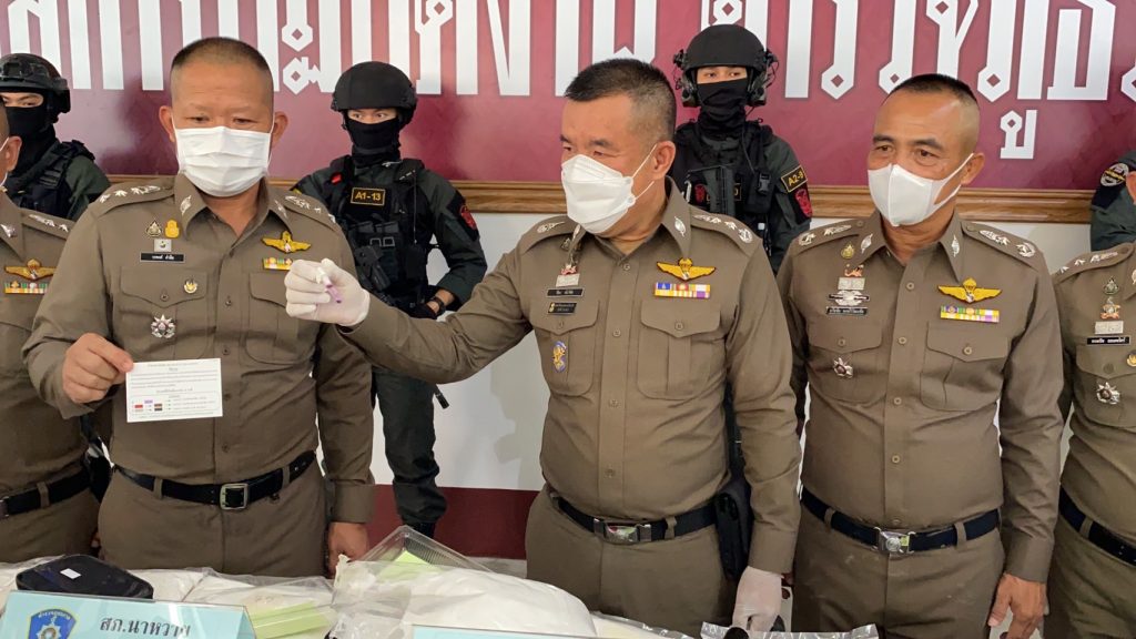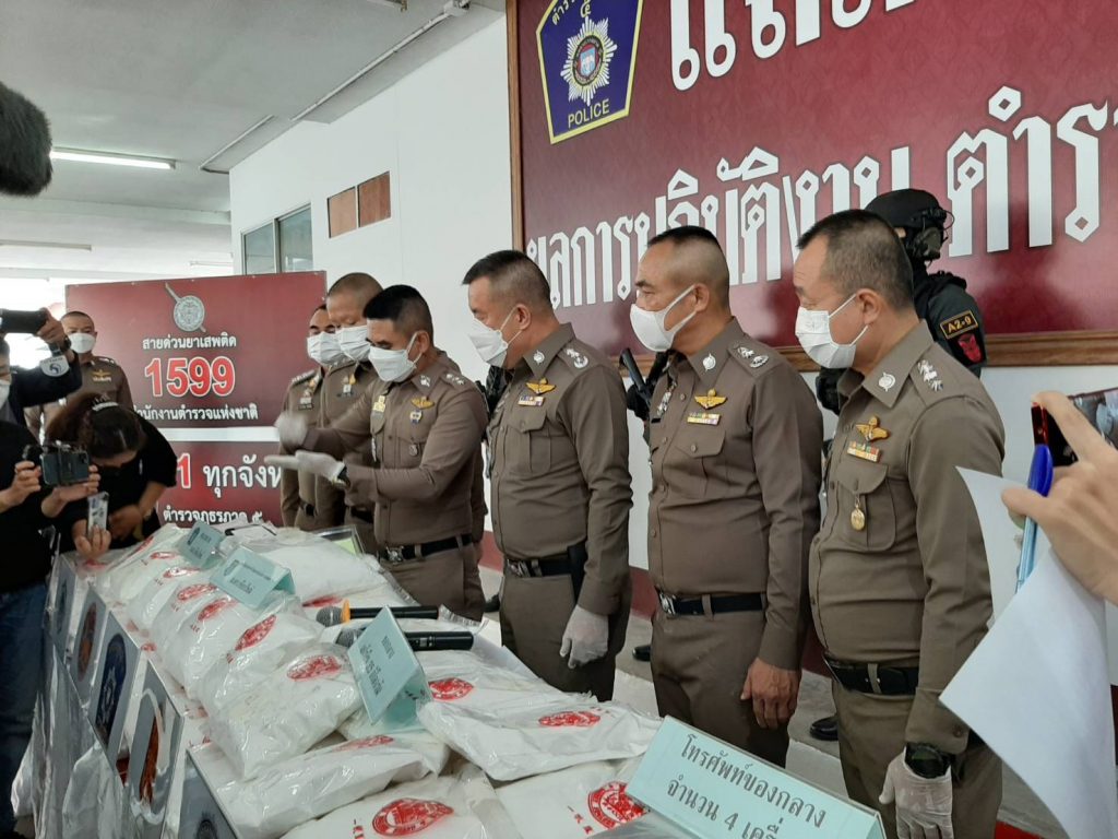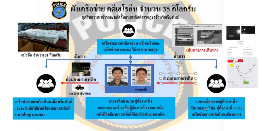เมื่อวันที่ 11 ตุลาคม 2564 เวลา 09.30 น. ตำรวจภูธรภาค 5 ภายใต้การอำนวยการของ พล.ต.ท.ปิยะ ต๊ะวิชัย ผบช.ภ.5 พร้อมด้วย พล.ต.ต.ธวัชชัย พงษ์วิวัฒนชัย ผบก.ภ.จ.เชียงใหม่,พล.ต.ต.วรพงค์ คำลือ ผบก.บก.สส.ภ.5 และ พ.ต.อ.ทรงกริช ออนตะไคร้ รอง ผบก.ภ.จ.เชียงใหม่,พ.ต.อ.สกุลรัชช์ คงทอง ผกก.สภ.นาหวาย จ.เชียงใหม่ แถลงข่าวผลการจับกุมขบวนการลักลอบขนยาเสพติดรายสำคัญ พร้อมของกลาง เฮโรอีน 35 กิโลกรัม ในท้องที่ สภ.นาหวาย จ.เชียงใหม่ โดยมีผู้ต้องหาที่เกี่ยวข้องจำนวน 4 คน หลบหนีไปได้ 1 คน ดังนี้ 1.นายอาทิตย์ จะวอ อายุ 26 ปี ที่อยู่ 36 ม.15 ต.ม่อนปิ่น อ.ฝาง จ.เชียงใหม่,2.นายอาคาริ จะอื่อ อายุ 24 ปี ที่อยู่ 401 ม.3 ต.บ้านหลวง อ.แม่อาย จ.เชียงใหม่ (หลบหนี),3.นายจะอื่อ จะทอป่า อายุ 36 ปี ที่อยู่ 338 ม.10 ต.ม่อนปิ่น อ.ฝาง จ.เชียงใหม่ และ4.นายจะนู (นามสมมุติ) อายุ 15 ปี