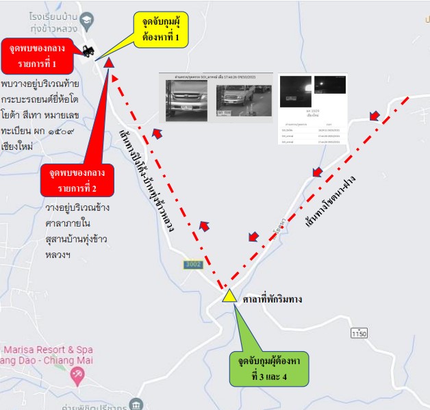 ต่อมาเจ้าพนักงานตำรวจพบกลุ่มผู้ต้องหา อยู่ที่ศาลาที่พักริมทาง สามแยกปิงโค้ง ขาเข้าเมืองฯ ซึ่งจากการสังเกตพบว่า มีการพูดคุยโทรศัพท์โดยการใช้หูฟังอยู่ตลอดเวลา ซึ่งสงสัยว่าจะทำหน้าที่ ดูต้นทางให้กับกลุ่มลำเลียงยาเสพติดตามที่สายลับแจ้ง ต่อมาตามเวลาจับกุมเจ้าพนักงานตำรวจพบรถยนต์ยี่ห้อโตโยต้า สีเทา หมายเลขทะเบียน ผก 1509 เชียงใหม่ ขับรถยนต์คันดังกล่าวมาจากอ.ไชยปราการ จ.เชียงใหม่ เจ้าพนักงานตำรวจที่เฝ้าสังเกตการณ์บริเวณดังกล่าวเห็นว่ามีการส่งสัญญาณโดยการชี้ทางให้รถยนต์คันดังกล่าวให้ทำการเลี้ยวขวาที่แยกปิงโค้ง โดยมีชายขับขี่รถจักรยานยนต์ไม่มียี่ห้อ สีและหมายเลขทะเบียน ซึ่งจอดรออยู่เป็นผู้ขับนำทางรถยนต์ของกลุ่มผู้ต้องหามุ่งหน้ามาทางบ้านห้วยทรายชาวฯ ซึ่งเจ้าพนักงานตำรวจที่เฝ้าสังเกตการณ์อยู่ ทำการขับติดตามรถคันดังกล่าวไป พบว่ารถยนต์คันดังกล่าวได้เลี้ยวขวาเข้าไปในสุสานบ้านทุ่งข้าวหลวงฯ ซึ่งสงสัยว่าอาจเป็นรถที่เกี่ยวข้องกับการลำเลียงยาเสพติดตามที่สายลับแจ้ง