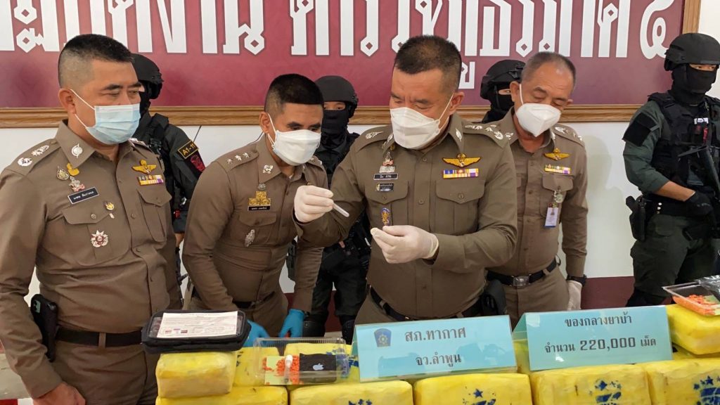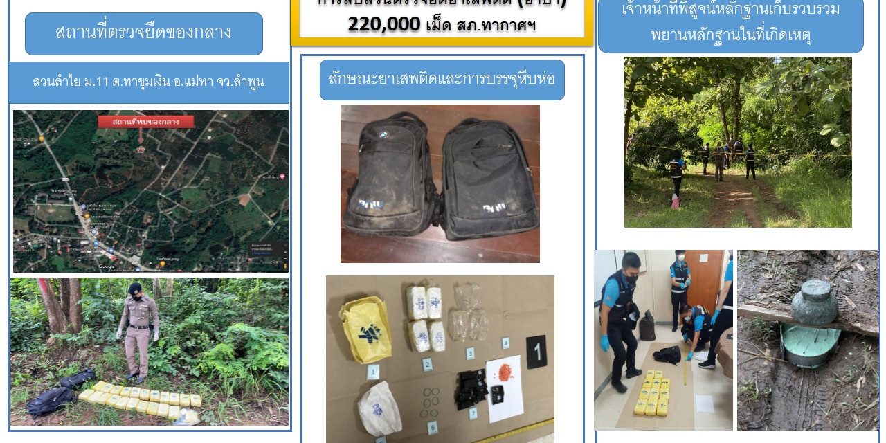 ภายใต้การอำนวยการของ พล.ต.ท.ปิยะ ต๊ะวิชัย ผบช.ภ.5,พล.ต.ต.มงคล สัมผวะผล ผบก.ภ.จ.ลำพูน พร้อมด้วย ผกก. และ รอง ผกก.ป.สภ.ทากาศ จ.ลำพูน ร่วมแถลงผลการตรวจยึดยาบ้า ประมาณ 220,000 เม็ด