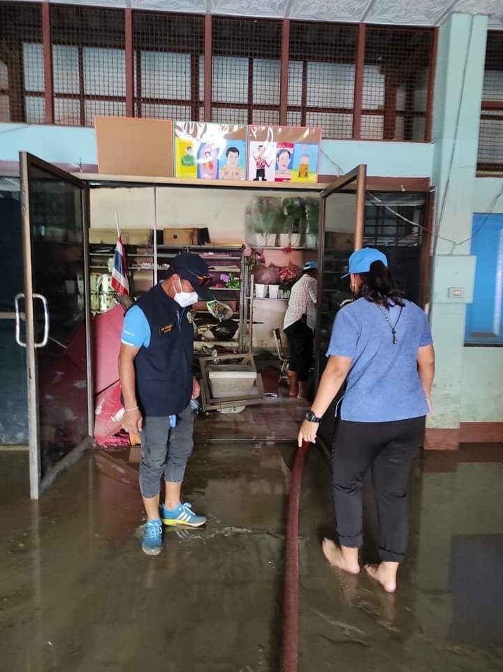 ประเวศน์ ศิริศิลป์ ผู้อำนวยการโครงการชลประทานสระบุรี สำนักงานชลประทานที่ 10 มอบหมายเจ้าหน้าที่พร้อมรถบรรทุกน้ำ ขนาด 6,000 ลิตร เพื่อให้ความช่วยเหลือในการล้างทำความสะอาดอาคารโรงเรียน วัดม่วงน้อย สระบุรี