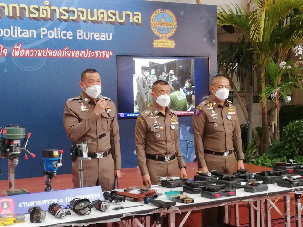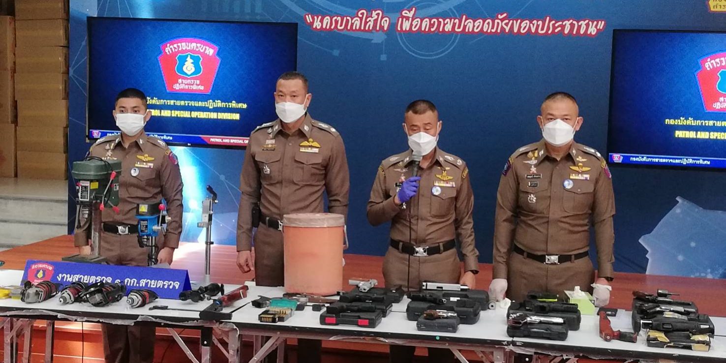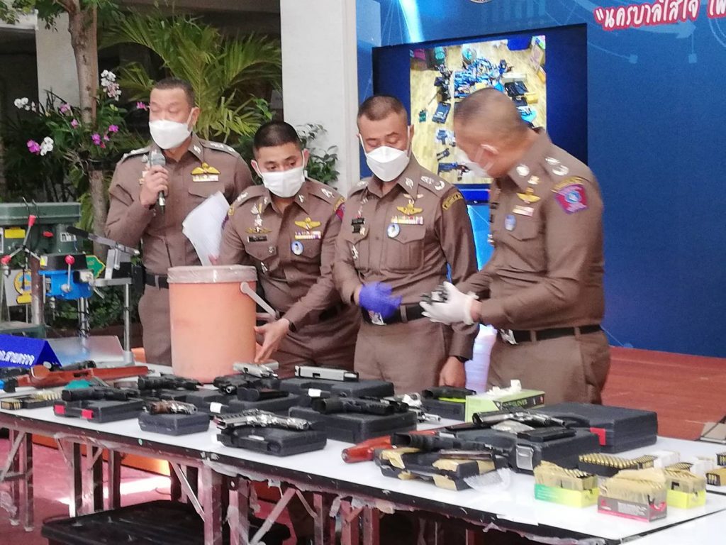 พร้อมด้วยของกลาง อาวุธปืนดัดแปลงขนาด.380 ยี่ห้อ SUR จำนวน 1 กระบอก,อาวุธปืนวินกันดัดแปลงขนาด .38 จำนวน 1 กระบอก,อาวุธปืนไทยประดิษฐ์ (หักลำ) ขนาด .38 จำนวน 1 กระบอก,อาวุธปืนดัดแปลงขนาด.380 ยี่ห้อ ZORAKI จำนวน 1 กระบอก,เครื่องกระสุนขนาด.38 จำนวน 15 นัด,เครื่องกระสุนปืน ขนาด .380 จำนวน 9 นัด,อาวุธปืนดัดแปลงขนาด .380 จำนวน 1 กระบอก,อาวุธปืนลูกโม่ ขนาด .38 หมายเลขประจำปืน กท.1916847 พร้อมเครื่องกระสุน จำนวน 13 นัด,อาวุธปืนกึ่งอัตโนมัติยี่ห้อราม่า พร้อมเครื่องกระสุนขนาด.38 ซุปเปอร์ จำนวน 12 นัด,เครื่องกระสุนขนาด.22 จำนวน 5 กล่อง รวมจำนวน 250 นัด,เครื่องกระสุนขนาด.38 ซุปเปอร์ จำนวน 100 นัด,เครื่องกระสุนขนาด.380 จำนวน 92 นัด,ท่อลดเสียง จำนวน 2 ท่อ,อาวุธปืนดัดแปลงขนาด .380 ยี่ห้อ Kuzey พร้อมแม็กกาซีน จำนวน 1 กระบอก,อาวุธปืนดัดแปลงขนาด.380 ยี่ห้อCEONIC พร้อมแม็กกาซีน จำนวน 1กระบอก,อาวุธปืนดัดแปลง ขนาด.380 พร้อมแม็กกาซีน จำนวน 1 กระบอก,อาวุธปืนดัดแปลงขนาด.380 ยี่ห้อ BIOW จำนวน 1 กระบอก,อาวุธปืนลูกโม่วินกันดัดแปลง ขนาด .38 จำนวน 1 กระบอก,อาวุธปืนไทยประดิษฐ์หักลำขนาด.22 จำนวน 1 กระบอก,อาวุธปืนดัดแปลงขนาด.380 ยี่ห้อ SISSC จำนวน 1 กระบอก,อาวุธปืนดัดแปลงขนาด.380 ยี่ห้อ KUZEY จำนวน 1 กระบอก,อาวุธปืนดัดแปลงขนาด.380 ยี่ห้อ ZORAKI จำนวน 1 กระบอก,อาวุธปืนยาวขนาด. 22 ไม่มีหมายเลขทะเบียน จำนวน 1 กระบอก,อาวุธปืนไทยประดิษฐ์ลูกซองสั้น จำนวน 1 กระบอก,อาวุธปืนยาว ขนาด .22 จำนวน 1 กระบอก,เครื่องกระสุนปืน ขนาด.22 จำนวน 40 นัอ,เครื่องกระสุนปืน ขนาด.380 จำนวน 19 นัด,เครื่องกระสุนปืนขนาด.38 จำนวน 30 นัด,เครื่องกระสุนปืนขนาด .38 (ซ้อม) จำนวน 10 นัด,สว่านไฟฟ้า จำนวน 3 ตัว,หินเจียรไฟฟ้า จำนวน 2 ตัว, เลื่อยตัดเหล็ก จำนวน 1 อัน,เวอร์เนียร์ จำนวน 1 อัน รวม อาวุธปืนทั้งสิ้น 19 กระบอก เป็นอาวุธปืนยาว 1 กระบอก, ปืนสั้น 18 กระบอก และเครื่องกระสุนปืน 590 นัด