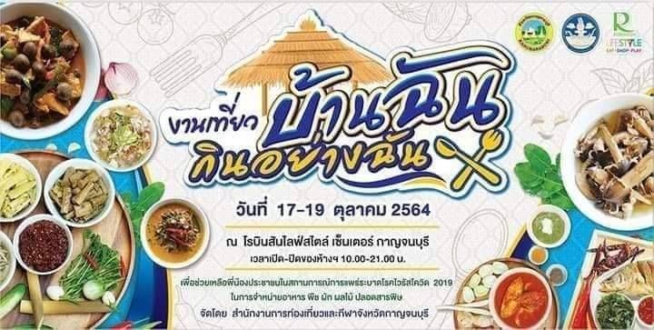 “จังหวัดกาญจนบุรี โดยสำนักงานการท่องเที่ยวและกีฬาจังหวัดกาญจนบุรี ขอเชิญพ่อแม่พี่น้องชาวกาญจนบุรี และนักท่องเที่ยวผู้มาเยือนทุกท่าน สัมผัสประสบการณ์ความสุข ความอร่อยกับอาหารนานาชนิด พร้อมพืช ผัก ผลไม้ ปลอดสารพิษ ในงาน “เที่ยวบ้านฉัน กินอย่างฉัน” เพื่อช่วยเหลือพี่น้องประชาชนในสถานการณ์การแพร่ระบาดโรคไวรัสโควิด ๒๐๑๙ ในการจำหน่ายอาหาร พืช ผัก ผลไม้ ปลอดสารพิษ