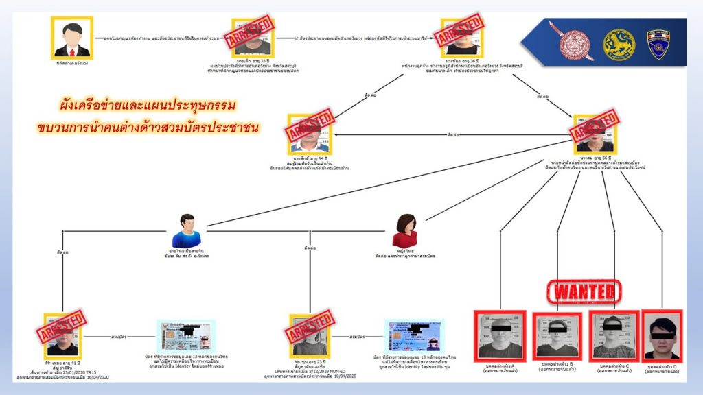 เจ้าหน้าที่ตำรวจ กก.สส.บก.ตม.1 ได้ทราบข้อมูลจากสายลับว่ามีขบวนการรับจ้างสวมบัตรประชาชนไทย ให้กับบุคคลต่างด้าว ที่มีความประสงค์จะมีบัตรประชาชนไทย โดยอาศัยช่องโหว่และขั้นตอนกระบวนการอันทุจริต ไม่เป็นไปตามกฎหมาย นับเป็นหนึ่งในภัยคุกคามต่อความมั่นคงในราชอาณาจักร สำนักงานตรวจคนเข้าเมือง โดยกองกำกับการสืบสวน กองบังคับการตรวจคนเข้าเมือง 1 ได้เร่งลงพื้นที่สืบสวนหาข่าว จนทราบแหล่งที่ซ่อนตัว ของบุคคลต่างด้าวสัญชาติจีนรายหนึ่ง คือนายเหม่ย และบุคคลต่างด้าวสัญชาติมาเลเซียอีกรายหนึ่งคือนางสาวซุน หลังตรวจพบมีพฤติกรรมในการแอบอ้าง สวมรายการข้อมูลบัตรประชาชนบุคคลสัญชาติไทย ที่ปรากฏข้อมูลอยู่บนฐานข้อมูลทะเบียนราษฎร์แต่ไม่มีความเคลื่อนไหวทางทะเบียน จึงได้สืบสวนติดตามจนนำไปสู่การจับกุม ผู้ต้องหาให้การสารภาพโดยรับว่าได้ว่าจ้างให้นายหน้าคนไทยดำเนินการโดยเสียค่าจ้างไปเป็นจำนวนเงินกว่า 1 ล้านบาท โดยในการสืบสวนในครั้งนี้ ทางสำนักงานตรวจคนเข้าเมืองได้รับความร่วมมือในการประสานงานข้อมูลทางทะเบียนในเชิงลึก กับทางสำนักการสอบสวนและนิติการ กรมการปกครอง จนทราบข้อมูลโครงข่ายและแผนประทุษกรรมของขบวนการสวมบัตรประชาชนไทยให้กับบุคคลต่างด้าวโดยทุจริต ดังนี้