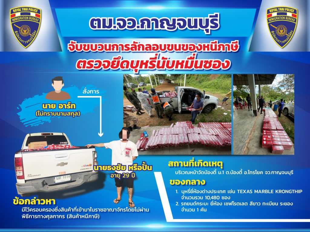 ก่อนจับกุมชุดสืบสวนตม.จ.กาญจนบุรี ได้สืบทราบว่ามีการลักลอบขนบุหรี่ต่างประเทศจากชายแดนบ้องตี้ อ.ไทรโยค เข้าไปส่งยังตัวเมืองกาญจนบุรีโดยมีลักษณะแอบแฝงขนส่งหลายแบบทั้งรถยนต์ รถจักรยานยนต์หรือรถบรรทุก ซึ่งเฝ้าติดตามข้อมูลจึงทราบว่าคนร้ายจะมีการลักลอบขนบุหรี่ใช้ยานพาหนะเป็นรถยนต์ โดยผู้ขับขี่เป็นชาย เมื่อทราบข้อมูลและช่วงเวลาจึงได้วางแผนจับกุมโดยบูรณาการกับกำลังหน่วยต่างๆ ตั้งจุดสกัดหลายจุดต่อเนื่องทั้งเส้นหลักและเส้นรองเนื่องจากคนร้ายมีความชำนาญเส้นทาง ซึ่งต่อมาขณะที่ชุดจับกุมได้ร่วมกันออกตรวจสอบ ถนนสายบ้องตี้-วังโพ ต.บ้องตี้ อ.ไทรโยค จ.กาญจนบุรี ได้พบบุคคลลักษณะคล้ายกับข้อมูลทางสืบสวนได้ขับรถยนต์ผ่านมา จึงได้แสดงตัวเข้าตรวจค้น ผลการตรวจค้นพบว่า ผู้ขับขี่คือนายธงชัย (ขอสงวนนามสกุล) สัญชาติไทย อายุ 29 ปี ท้ายเบาะหน้าและหลังมีกล่องกระดาษขนาดใหญ่