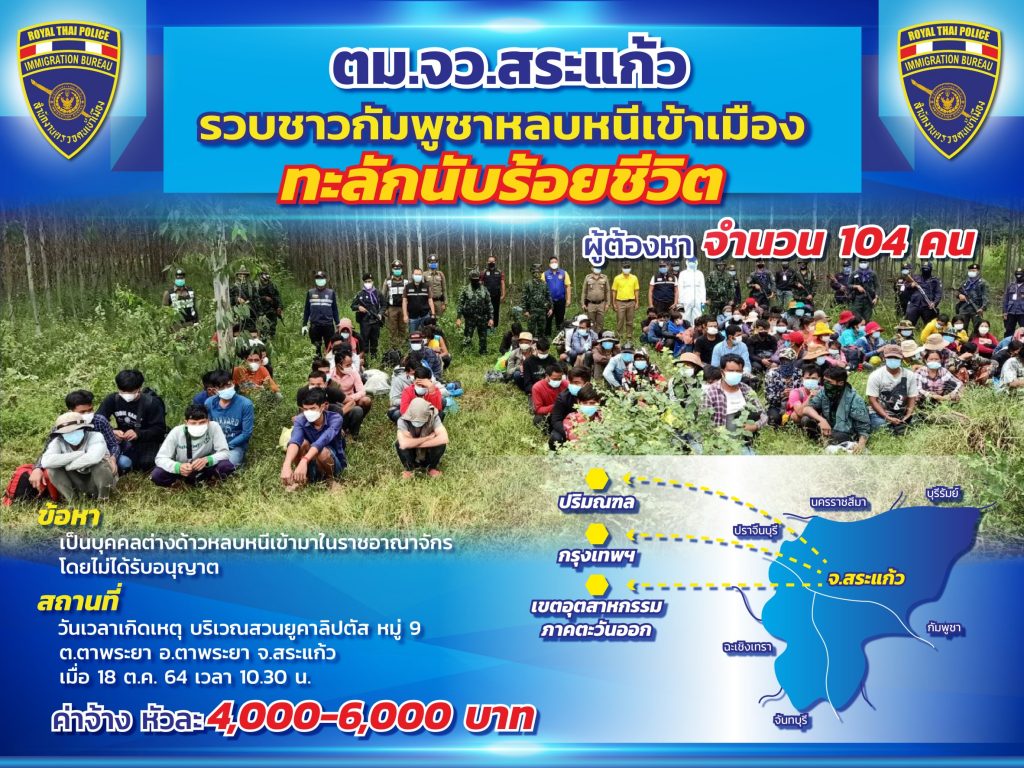 ก่อนทำการจับกุมเจ้าหน้าที่ชุดจับกุมสนองนโยบายผู้บังคับบัญชา ออกลาดตระเวน และซุ่มเฝ้าสังเกตการณ์บริเวณพื้นที่ ที่เป็นจุดเสี่ยงที่สำคัญ ซึ่งอาจเป็นช่องทางในการลักลอบหลบหนี ไม่เข้า-ออกตามช่องทางที่กำหนดตามกฎหมาย เพื่อสกัดกั้นการลักลอบหลบหนีเข้ามาในราชอาณาจักรและการกระทำผิดกฎหมายต่างๆ ซึ่งในเวลาต่อมาเมื่อวันที่ 18 ต.ค.64 เวลาประมาณ 10.30 น.ได้ตรวจพบกลุ่มบุคคลจำนวนมากรวมตัวอยู่บริเวณสวนยูคาลิปตัส ในหมู่ 9 ต.ตาพระยา อ.ตาพระยา จ.สระแก้ว และมีลักษณะมีพิรุธน่าสงสัยจึงได้เข้าแสดงตัวว่าเป็นเจ้าหน้าที่ตำรวจและขอทำการตรวจสอบ ผลการตรวจสอบพบว่าเป็นบุคคลต่างด้าวสัญชาติกัมพูชา หญิง-ชาย จำนวนรวมกัน 104 คน ไม่มีเอกสารการเข้ามาในราชอาณาจักรให้ตรวจสอบและรับว่าพวกตนเพิ่งลักลอบเดินเท้าเข้ามาในราชอาณาจักรทางช่องทางธรรมชาติในช่วงเวลากลางคืนของวันที่ 17 ต.ค.64 ในระหว่างนี้รอรถมารับแต่ถูกเจ้าหน้าที่ตรวจพบและสกัดจับได้ก่อน จึงจับกุมตัวทั้งหมดและนำตัวส่งดำเนินคดีตามกฎหมาย