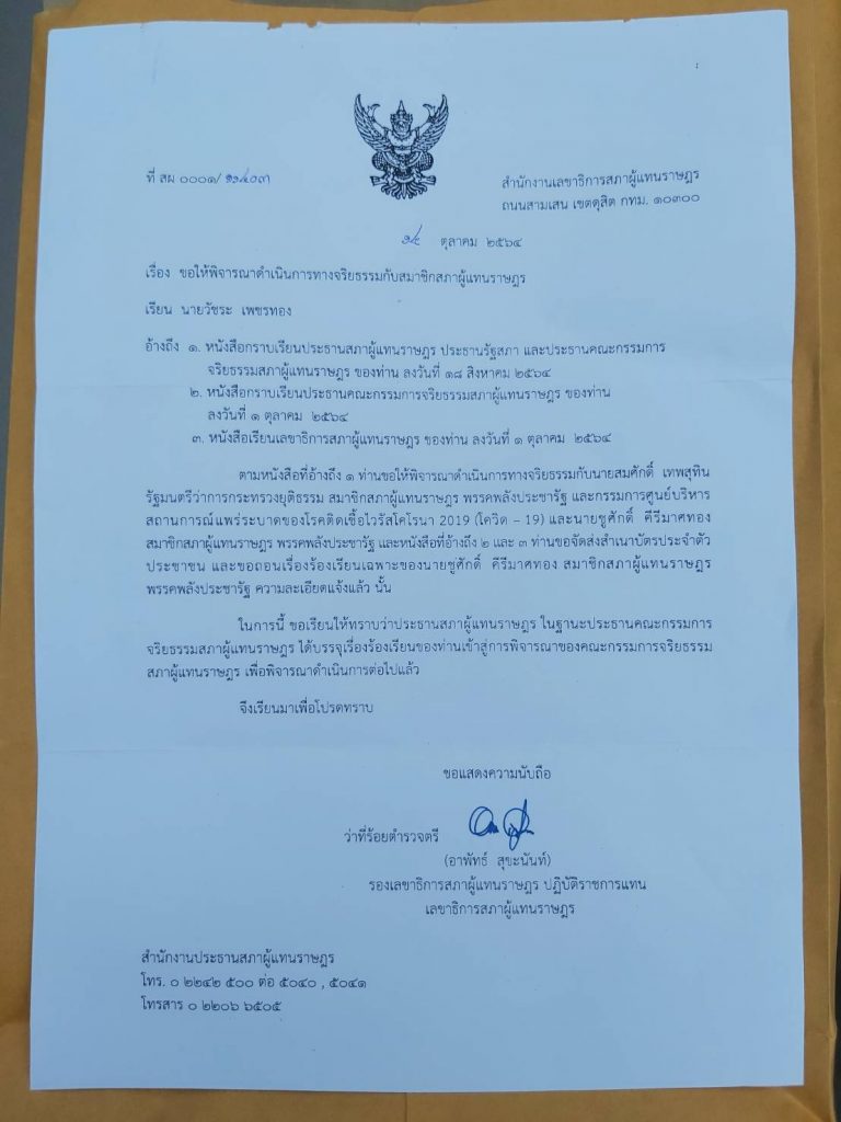 (22 ต.ค.64)นายวัชระ เพชรทอง อดีตส.ส.พรรคประชาธิปัตย์ กล่าวว่า ว่าที่ร้อยตำรวจตรีอาพัทธ์ สุขะนันท์ รองเลขาธิการสภาผู้แทนราษฎร ปฏิบัติราชการแทนเลขาธิการสภาผู้แทนราษฎร ส่งหนังสือถึงตนเมื่อวันที่ 14 ต.ค.64 แจ้งให้ทราบว่า ตามที่ได้ส่งหนังสือถึงนายชวน หลีกภัย ประธานสภาผู้แทนราษฎร และประธานคณะกรรมการจริยธรรมสภาผู้แทนราษฎร นางพรพิศ เพชรเจริญ เลขาธิการสภาผู้แทนราษฎร ขอให้พิจารณาดำเนินการทางจริยธรรมกับนายสมศักดิ์ เทพสุทิน รัฐมนตรีว่าการกระทรวงยุติธรรม และส.ส.พรรคพลังประชารัฐ และขอถอนเรื่องร้องเรียนเฉพาะของนายชูศักดิ์ คีรีมาศทอง ส.ส.พรรคพลังประชารัฐ จากกรณีเมื่อวันที่ 12 เม.ย.64 เวลาประมาณ 19.00 น. นายสมศักดิ์พร้อมคณะเดินทางไปที่ร้านคาเฟ่ เดอ ทรี อ.เมือง จ.สุโขทัย ร่วมกิจกรรมชุมนุมคน มีการจัดรดน้ำตามประเพณีสงกรานต์ และงานเลี้ยงสังสรรค์ ร้องเพลงคาราโอเกะ ดื่มเครื่องดื่มแอลกอฮอล์ โดยไม่ใส่หน้ากากอนามัย มีผู้ร่วมงานทั้งสิ้นประมาณ 21 คน อันเป็นการกระทำผิดกฎหมายหลายฉบับ เป็นการร่วมชุมนุมฝ่าฝืนพระราชกำหนดในสถานการณ์ฉุกเฉินพ.ศ 2548 มั่วสุมกันตั้งแต่ 10 คนขึ้นไป ผิดพรบ.โรคติดต่อ พ.ศ.2558 ฝ่าฝืนประกาศหรือคำสั่งในสถานการณ์โควิด-19 ของนายกรัฐมนตรี และจังหวัดสุโขทัย กระทบกระเทือนต่อจิตใจของประชาชนที่เคารพกฎหมายทั้งประเทศ ทั้งที่นายสมศักดิ์ มีตำแหน่งรัฐมนตรีว่าการกระทรวงยุติธรรม และกรรมการศูนย์บริหารสถานการณ์แพร่ระบาดของโรคโควิด-19 ควรต้องเป็นแบบอย่างที่ดีของประชาชน เพราะอยู่ในช่วงของการแพร่ระบาดโรคระลอกที่ 3 แต่ยังบังอาจฝ่าฝืนคำสั่งนายกรัฐมนตรี และกฎหมาย อันเป็นความผิดอาญาและมาตรฐานทางจริยธรรม ผลของการจัดงานดังกล่าวทำให้ผู้ร่วมงานติดโรคโควิด-19 จำนวน 21 คน และแพร่ไปทั่วจังหวัดสุโขทัย จำนวน 55 คน มีผู้เสียชีวิตถึง 3 คนนั้น บัดนี้ ประธานสภาผู้แทนราษฎร ในฐานะประธานคณะกรรมการจริยธรรมสภาผู้แทนราษฎร ได้บรรจุเรื่องร้องเรียนดังกล่าวเข้าสู่การพิจารณาของคณะกรรมการจริยธรรมสภาผู้แทนราษฎร เพื่อพิจารณาดำเนินการแล้ว