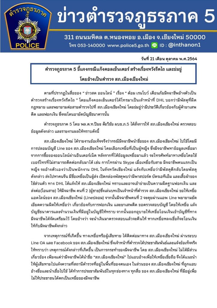 ตามที่ปรากฏในสื่อของ “ข่าวสด ออนไลน์” เรื่อง “ต้อม เรนโบว์ เตือนภัยมิจฉาชีพอ้างตัวเป็นตำรวจสร้างเรื่องหวังรีดไถ” โดยแก๊งคอลเซ็นเตอร์ได้โทรมาเป็นเจ้าหน้าที่ DHL บอกว่ามีพัสดุที่ผิดกฎหมาย และพยายามต่อสายตำรวจไปที่ สภ.เมืองเชียงใหม่ โดยข่มขู่ว่ามีประวัติเกี่ยวข้องกับผู้ค้ายาเสพติด และฟอกเงิน ซึ่งจะโดนอายัดบัญชีธนาคารนั้น ตำรวจภูธรภาค 5 โดย พล.ต.ท.ปิยะ ต๊ะวิชัย ผบช.ภ.5 ได้สั่งการให้ สภ.เมืองเชียงใหม่ ตรวจสอบข้อมูลดังกล่าว และรายงานผลให้ทราบดังนี้
