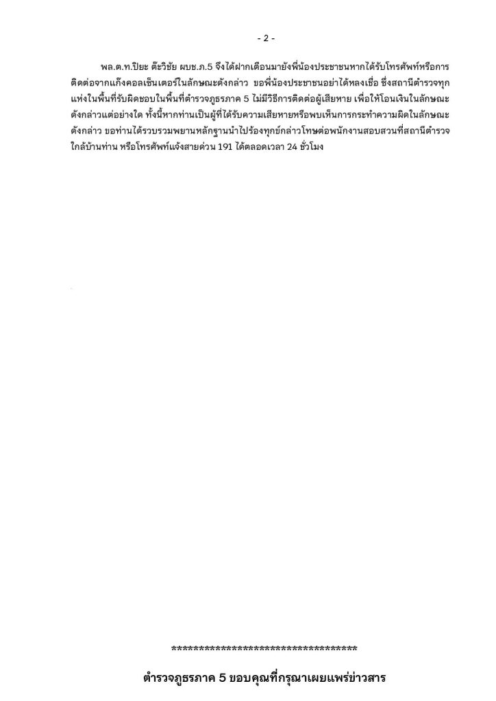 พล.ต.ท.ปิยะ ต๊ะวิชัย ผบช.ภ.5 จึงได้ฝากเตือนมายังพี่น้องประชาชนหากได้รับโทรศัพท์หรือการติดต่อจากแก๊งคอลเซ็นเตอร์ในลักษณะดังกล่าว ขอพี่น้องประชาชนอย่าได้หลงเชื่อ ซึ่งสถานีตำรวจทุกแห่งในพื้นที่รับผิดชอบในพื้นที่ตำรวจภูธรภาค 5 ไม่มีวิธีการติดต่อผู้เสียหาย เพื่อให้โอนเงินในลักษณะดังกล่าวแต่อย่างใด ทั้งนี้หากท่านเป็นผู้ที่ได้รับความเสียหายหรือพบเห็นการกระทำความผิดในลักษณะดังกล่าว ขอท่านได้รวบรวมพยานหลักฐานนำไปร้องทุกข์กล่าวโทษต่อพนักงานสอบสวนที่สถานีตำรวจใกล้บ้านท่าน หรือโทรศัพท์แจ้งสายด่วน 191 ได้ตลอดเวลา 24 ชั่วโมง