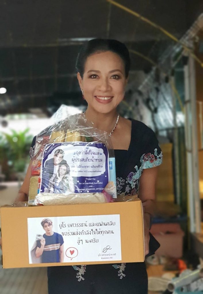 ไม่เพียงแค่นั้นยังมีพระเอกหนุ่ม ยูโร-ยศวรรธน์ พร้อมผองเพื่อนและแฟนคลับ นำกล่องและถุงยังชีพมามอบให้สาวกบ จำนวน 100 ชุด เพื่อนำไปแจกให้ชาวบ้าน ต.บางพลับ อ.สองพี่น้อง จ.สุพรรณบุรี อีกด้วย