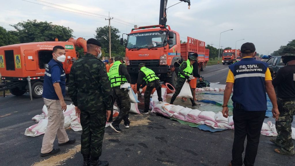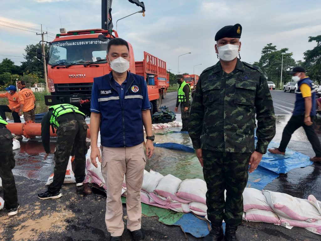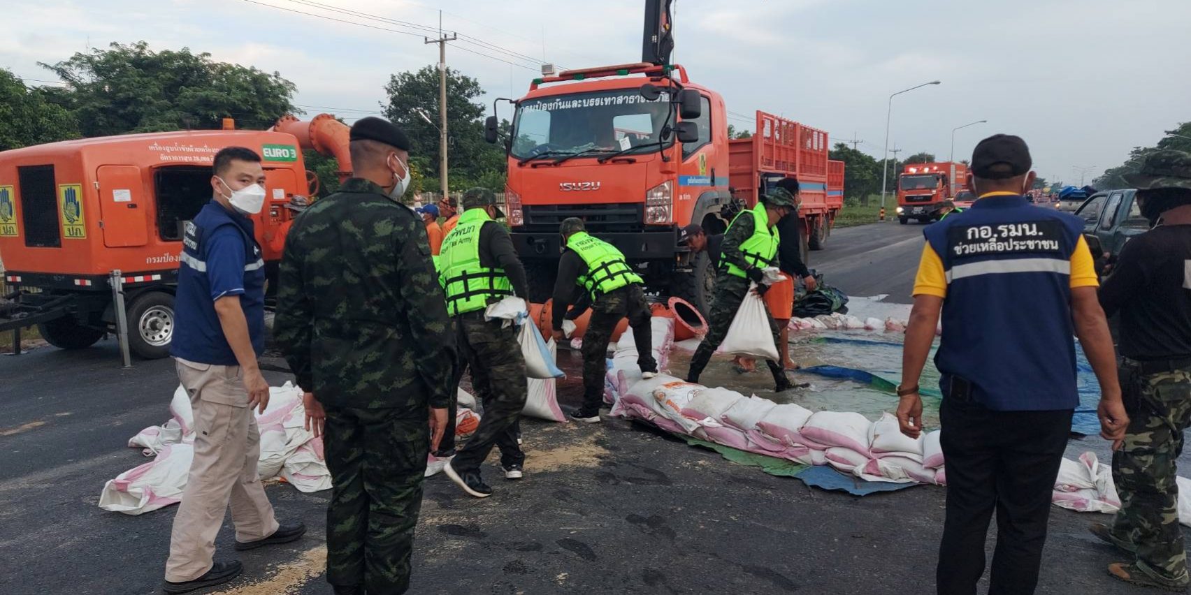 2.การวางกระสอบทรายขนาดใหญ่ (ถุง BIGBAG) อุดจุดที่น้ำเข้า โดยสามารถอุดสำเร็จพร้อมให้เสริมกระสอบทรายเพิ่มความแข็งแรง