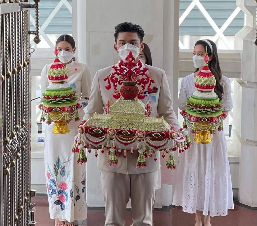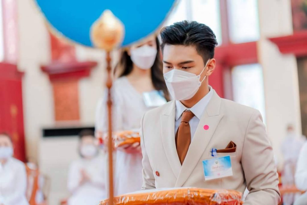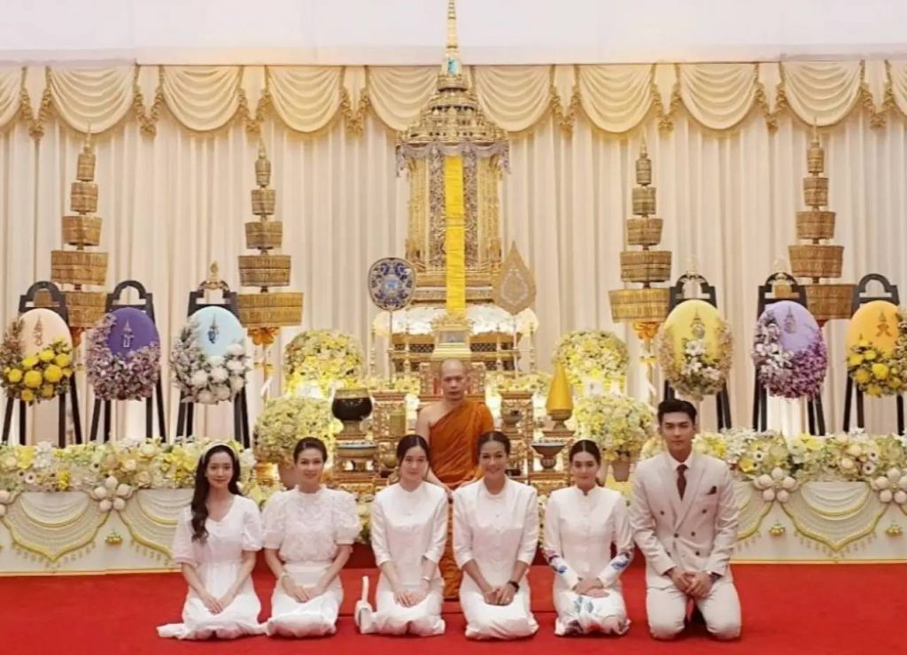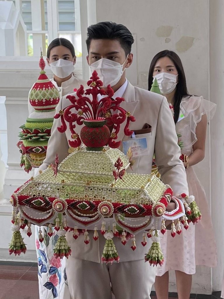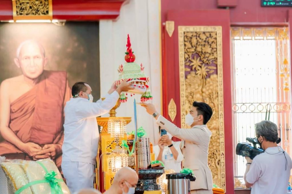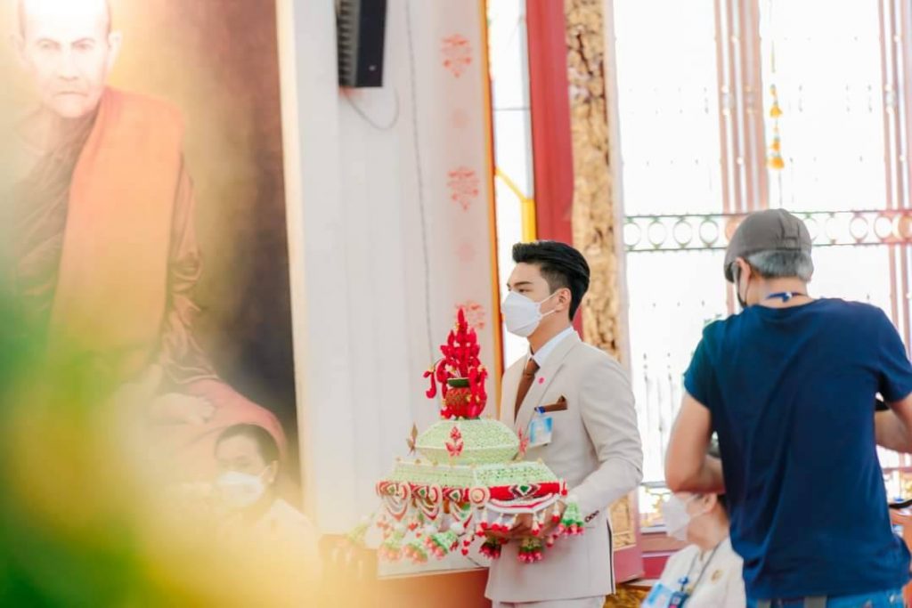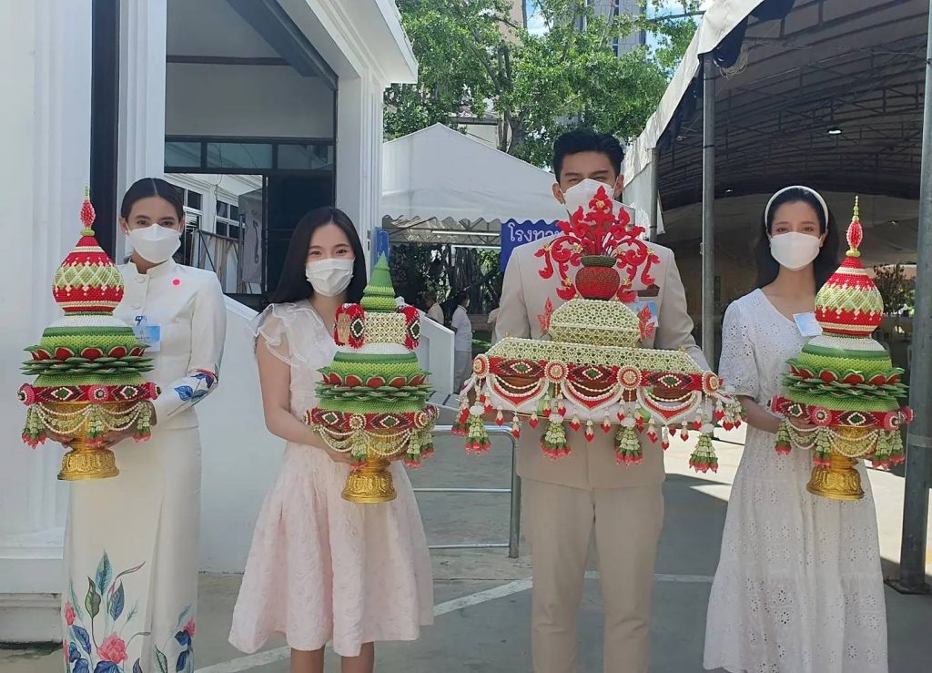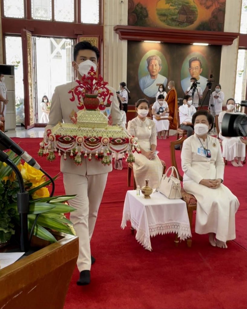 @@@เริ่มพิธีด้วยขบวนเชิญผ้าไตร โดย…หนุ่มโหน ธนากร พร้อมพานแว่นฟ้า พานสักการะ โดย มิ้นท์ บารมิตา, ชิงชิง คริษฐา และ ปันปัน สุทัตตา เป็นผู้อัญเชิญเข้าพิธี