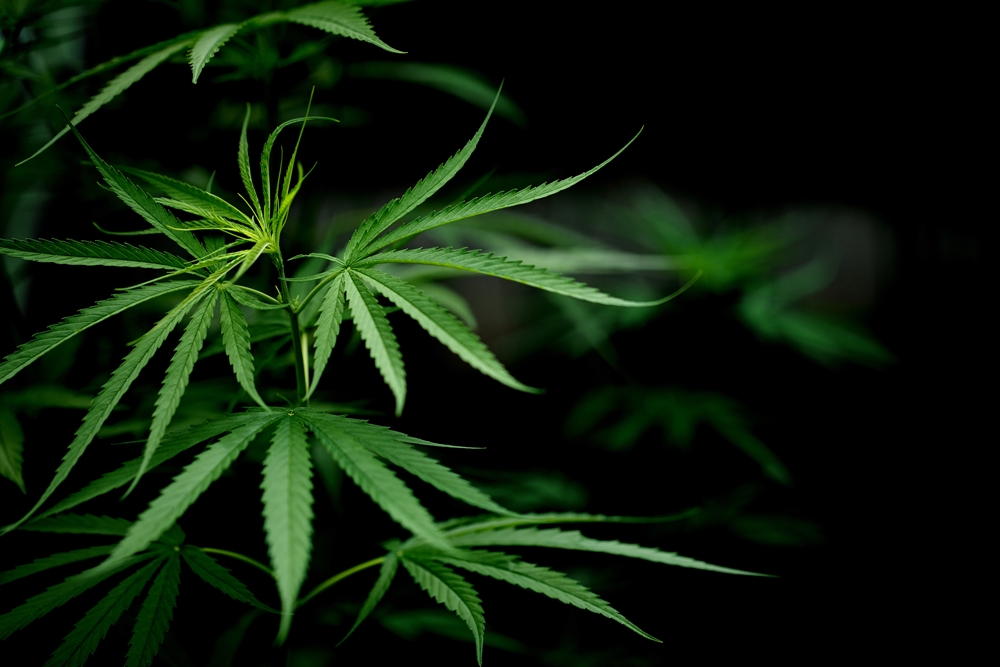 Cannabis marijuana leaf closeup dark background. leaves of a marijuana